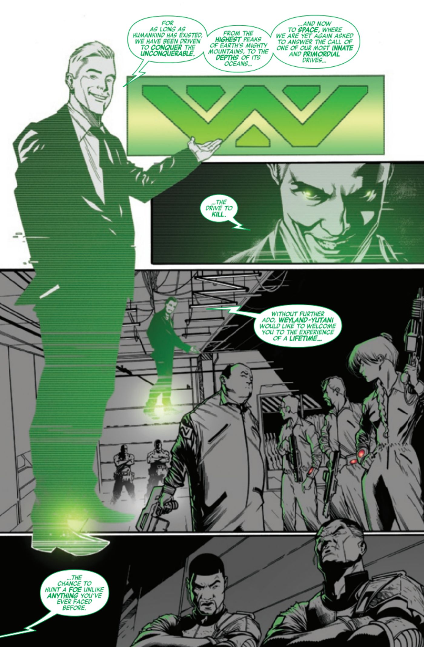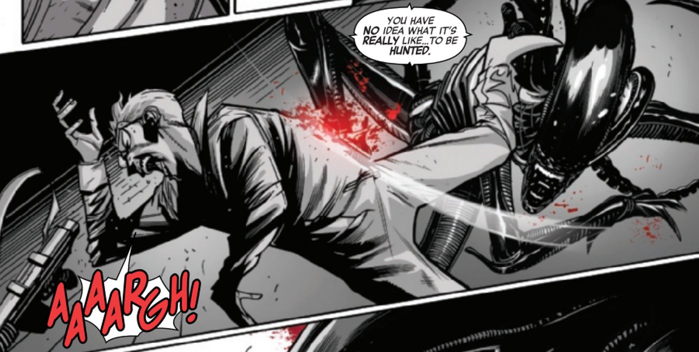 En Alien: Negro, Blanco y Sangre #1, la segunda historia de la antología, titulada “La caza” de Stephanie Phillips, Marcelo Ferreira y Pete Pantazis, sigue a un grupo de turistas que pagan mucho dinero para cazar xenomorfos en un complejo aislado patrocinado por Weyland-Yutani. Estos cazadores aficionados reciben las herramientas esenciales necesarias para sobrevivir con armas poderosas que son capaces de atravesar a los xenomorfos con facilidad. Sin embargo, para garantizar su seguridad, también se les proporciona un campo de fuerza móvil que evita cualquier posibilidad de muerte… hasta que las cosas van terriblemente mal.