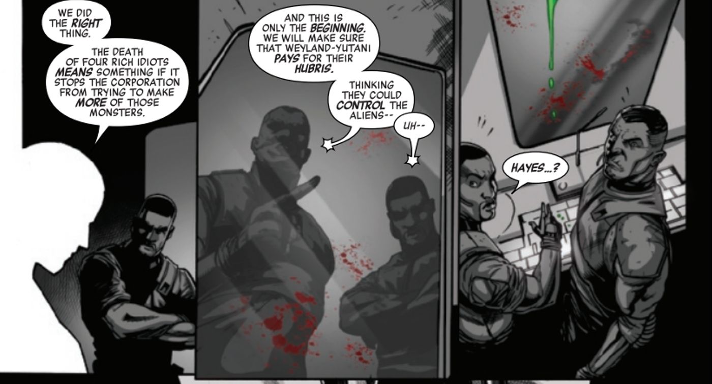 Sin embargo, se suma a esto al desviar la atención de los sujetos del parque a las personas que han pagado para estar allí. Dado que los xenomorfos son sólo animales con sed de sangre, tiene sentido explorar la dura realidad de llevarlos a una reserva de caza como esta, y los marines contratados para garantizar la seguridad de los cazadores son, de hecho, los que conducen a su desaparición. . Desactivan los campos de fuerza móviles y critican a los cazadores por ignorar por completo a las personas que se han sacrificado para que esto suceda. Es una crítica brillante sobre cómo el trabajador es constantemente puesto en peligro para que los ricos se sientan más cómodos.