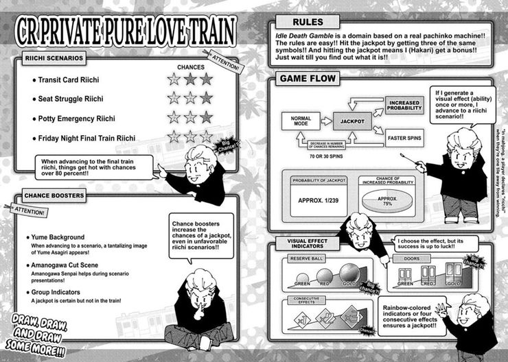 Al comienzo del capítulo 183, Hakari, supuestamente uno de los hechiceros más poderosos de la serie, usa su expansión de dominio contra el fallido mangaka Charles Bernard. Charles aprende de inmediato las reglas de la expansión del dominio de Hakari en un volcado de información masivo que también se comparte con el lector, pero no hace mucho para dilucidar cómo funciona su técnica. La técnica de Hakari se basa en la mecánica de una máquina de pachinko, y sus ataques varían en poder según la suerte. Es capaz de usar “potenciadores de oportunidad” y modos de juego alternativos como “tiempo de fiebre” para aumentar su probabilidad de obtener un premio mayor, lo que le otorgará una bonificación no revelada. También puede elegir cómo se manifiesta su técnica eligiendo diferentes “indicadores de efectos visuales”, como un par de puertas que se cierran, una bola de reserva y un multiplicador de efectos consecutivos. Además de todo esto, sus poderes pueden obtener potencia adicional o potenciadores de oportunidades a partir de escenas generadas aleatoriamente y “escenarios de riichi” que ocurren cuando está cerca de obtener un premio mayor.