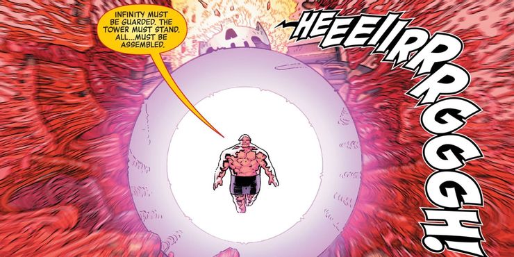 En Vengadores: para siempre # 3 por Jason Aaron y Aaron Kuder, Ghost Rider de Robbie Reyes está atrapado en un universo alternativo gobernado por una versión de Red Skull que se ha unido al simbionte Venom conocido como Black Skull. Dentro de esta realidad separada, los Vengadores se reúnen para rescatar a Ghost Rider y detener a Black Skull de una vez por todas. Este grupo de Vengadores está formado por Ant Man de Tony Stark, una Visión más robótica, Moon Knight de Mariama Spector, Wonder Man de Simon Williams y Infinity Thing de Ben Grimm. Si bien todos estos héroes tienen sus diferencias en comparación con sus contrapartes de Earth-616, The Thing se destaca por tener la mejora más dramática.
