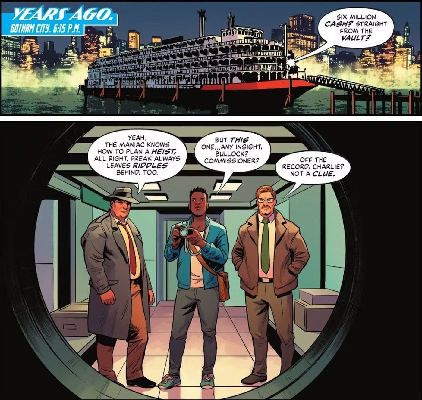 Mark Waid, Travis Moore, Tamra Bonvillain y Steve Wands Batman/Superman: los mejores del mundo #18 comienza con el Departamento de Policía de Gotham y el equipo de noticias del Daily Planet investigando el robo de Riddler de, muy específicamente, un crucero, y el primer panel deja claro ese escenario. Se ha dejado un mensaje escrito que Clark Kent inmediatamente reconoce como kryptoniano; Al mismo tiempo, Batman intenta resolver una serie de extrañas desapariciones en Gotham.