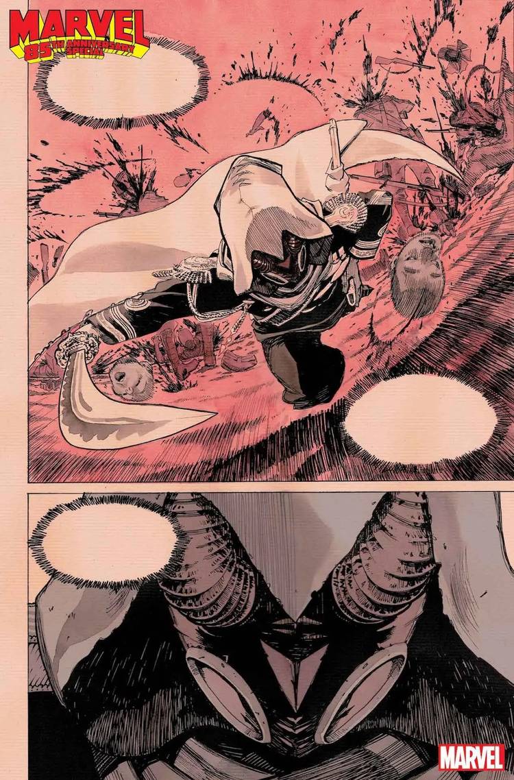 En un nuevo avance de una historia de Especial del 85 aniversario de Marvel #1 por Yuji Kaku, Moon Knight corre entre la multitud mientras corta cabezas indiscriminadamente con su espada. Lo único es que, aunque es el único que tiene la cabeza intacta, Ya no tiene rostro, sino una extraña máscara sin agujeros para los ojos. Definitivamente ya no es un rostro (o máscara) de apariencia humana.