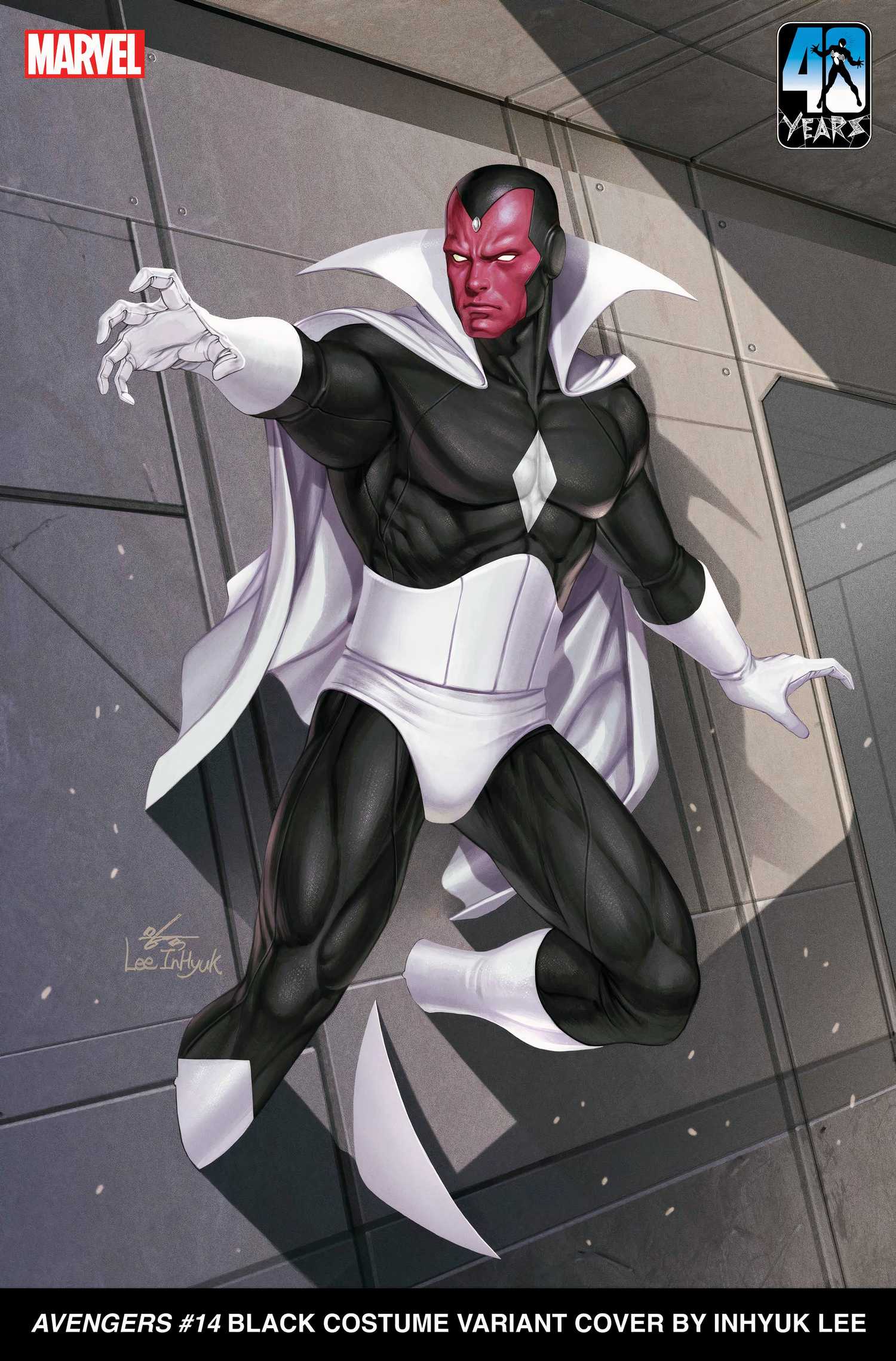 Marvel compartió un primer vistazo a las portadas variantes del traje negro, incluida la de Vengadores #14, en su sitio web. La portada, de InHyuk Lee, muestra a Vision atravesando una pared. Vision ha cambiado sus característicos trapos verdes y amarillos por otros nuevos en blanco y negro; todo lo que queda de su combinación de colores original es su cara roja.