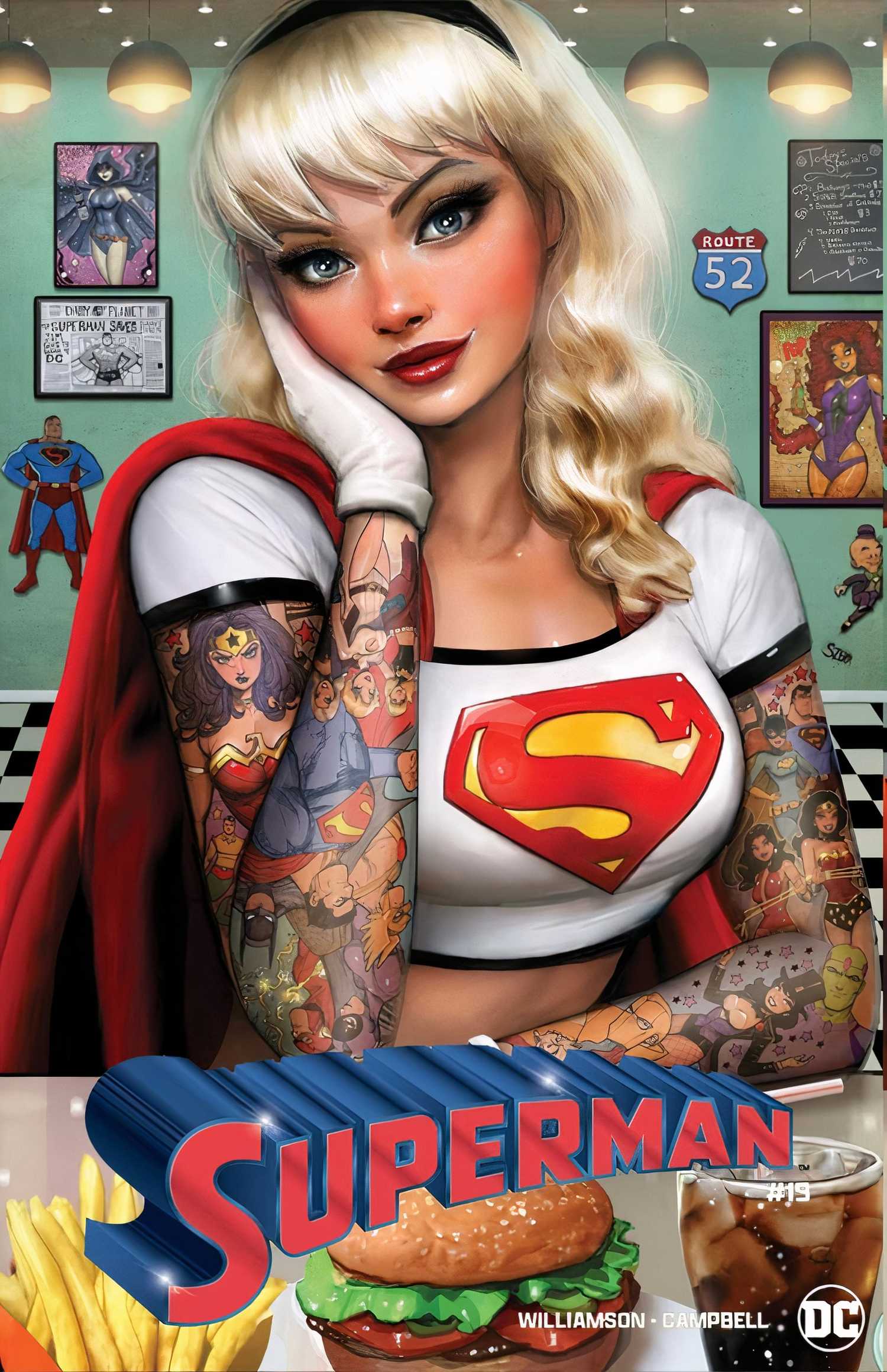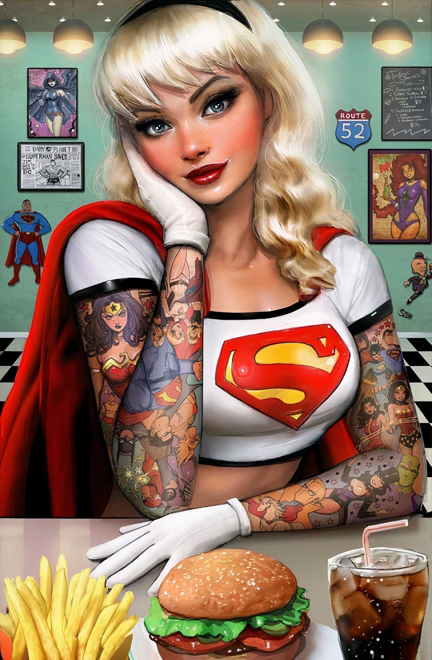 La variante Diner Tattoo de Szerdy captura brillantemente la estética clásica americana, caracterizada por diseños retro, artículos antiguos, comida de restaurante y autos clásicos. Esta estética se nutre de imágenes como los restaurantes que alguna vez se alinearon en los largos tramos de las carreteras rurales, las chicas pin-up y otros temas estadounidenses que evocan el espíritu de los Estados Unidos de mediados del siglo XX. Estos elementos se combinan para crear un telón de fondo vibrante para Kara, mejorando su apariencia digna de modelo y añadiendo profundidad a la portada variante. Con esta fusión de nostalgia y belleza, superchica Realmente encarna la esencia de una chica pin-up.