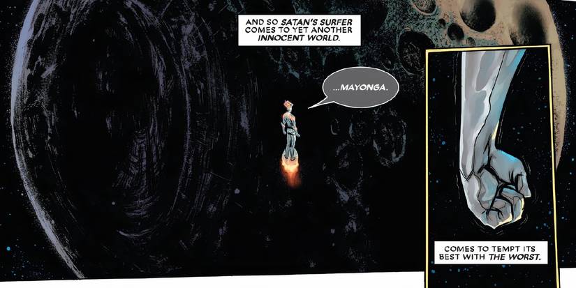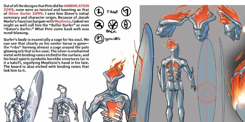 En la historia ambientada en el futuro de Aniquilación 2099 #4, Un Silver Surfer completamente nuevo y diferente recibe un par de nuevos nombres en clave: “Satan’s Surfer” y “The Surfer Surfer”, en honor a su origen oscuro. mientras que también rinde homenaje al maestro de Silver Surfer 2099, el mismísimo diablo del Universo Marvel, Mephisto.