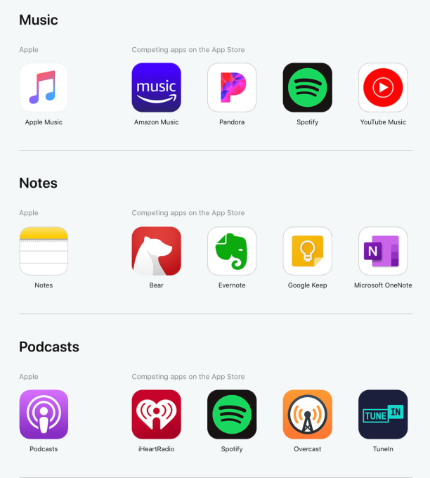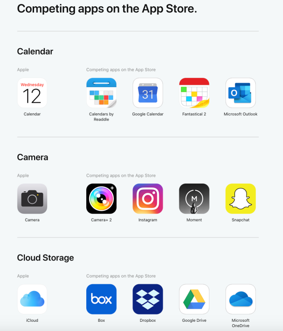 Por ejemplo, muestra cómo la propia aplicación de mensajes de Apple compite con Messenger, Slack, Snapchat y Viber; El correo de Apple compite con Gmail, Outlook, Spark y Yahoo Mail. Maps compite con Google Maps, Citymapper, MAPS.ME y Waze; y así.