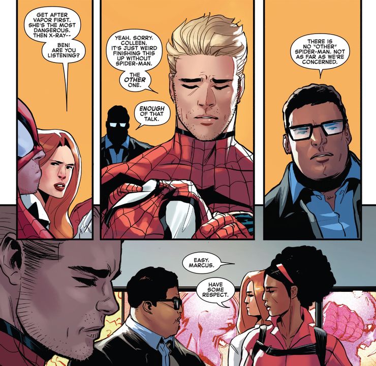 Empezando en El asombroso Hombre Araña # 75 de Zeb Wells y Patrick Gleason, las aventuras de Ben Reilly lo han visto vengar al Peter caído al derrotar a un cuadro de los villanos de la lista D, ya recientemente derrotados, los U-Foes (como para medir su popularidad inmediata), siendo mordidos por un Morbius desenfrenado, el vampiro viviente (que pronto será el tema de una gran película), y tener una pelea / equipo clásico con su compañero Spider-Man Miles Morales (también popular en otros medios, y para quien Beyond Corp. había ordenado a Ben que emitiera una orden de cese y desistimiento sobre el nombre y la imagen de Spider-Man). Si bien un Spider-Man vampiro puede parecer la rabia de los jóvenes hoy en día, el extraño metaconcepto involucrado parece ser un comentario sobre las dificultades inherentes que enfrenta un escritor para producir material artísticamente viable cuando adquiere un atractivo masivo de continuidad. personaje dependiente como Spider-Man, aunque solo sea la versión clon.