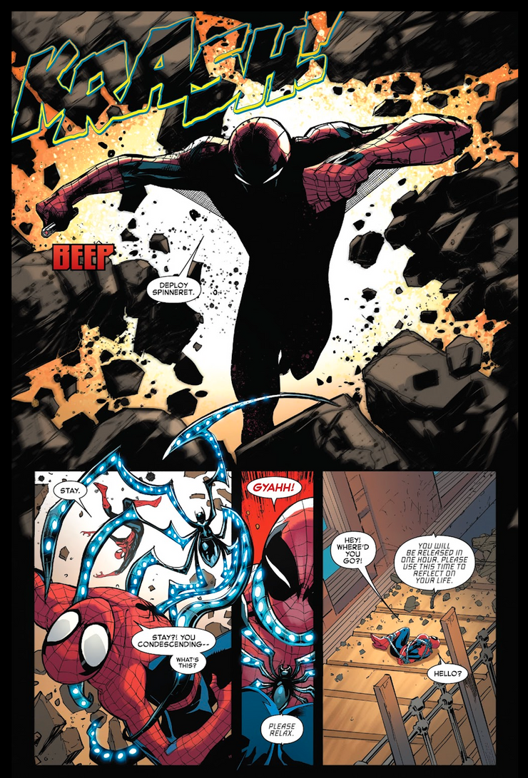 Peter llama a la figura, quien sorprendentemente trae una figura a sus labios, haciendo el gesto de “shhh”. Cuando Peter ataca, el hombre del traje de Spider-Man, que Peter descubrirá más tarde es su clon, Ben Reilly, simplemente dice “Despliegue la hilera”. Un dispositivo mecánico brillante emerge del traje de Ben Reilly, despliega patas de araña y envuelve a Peter, inmovilizándolo. Mientras Ben se aleja y desaparece, el dispositivo sujeta los brazos y las piernas de Peter mientras dice “Serás liberado en una hora. Aprovecha este tiempo para reflexionar sobre tu vida”.