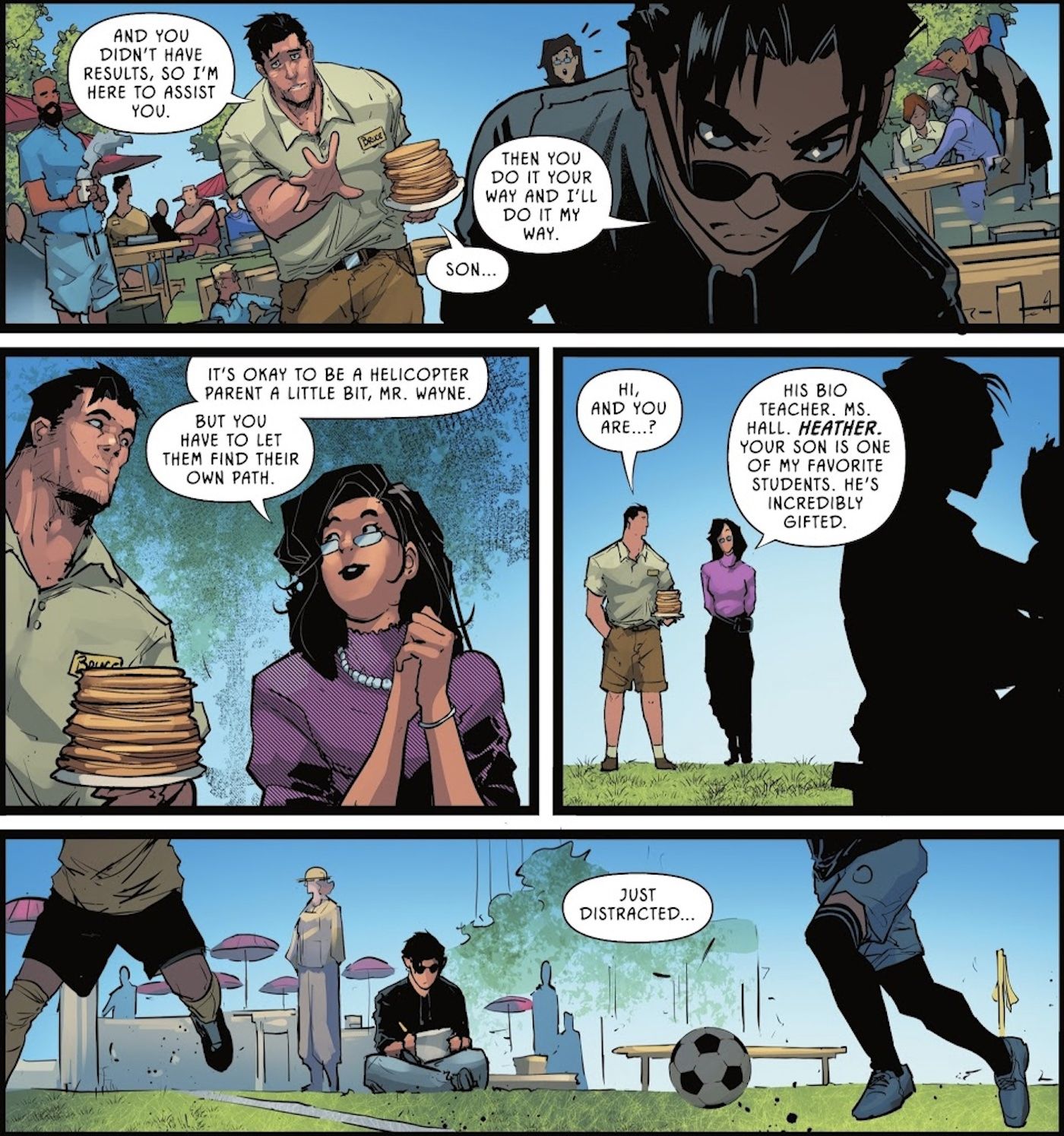 Dado que el director de la escuela secundaria de Damian, el director Stone, es sospechoso de la identidad de Shush, Batman ha instado a Robin a ir de incógnito y buscar pistas que conecten a los dos. Bruce incluso se ofrece como voluntario en las pruebas de fútbol de la escuela, insistiendo en que está allí para ayudar a Damian en su búsqueda. Sin embargo, rápidamente se hace evidente que Bruce podría estar más interesado en apoyar las actividades futbolísticas de su hijo. Además, cuando uno de los profesores de Damian sugiere que Damian avance al nivel universitario, Bruce admite que su único deseo es ver a su hijo hacer amigos de su edad.
