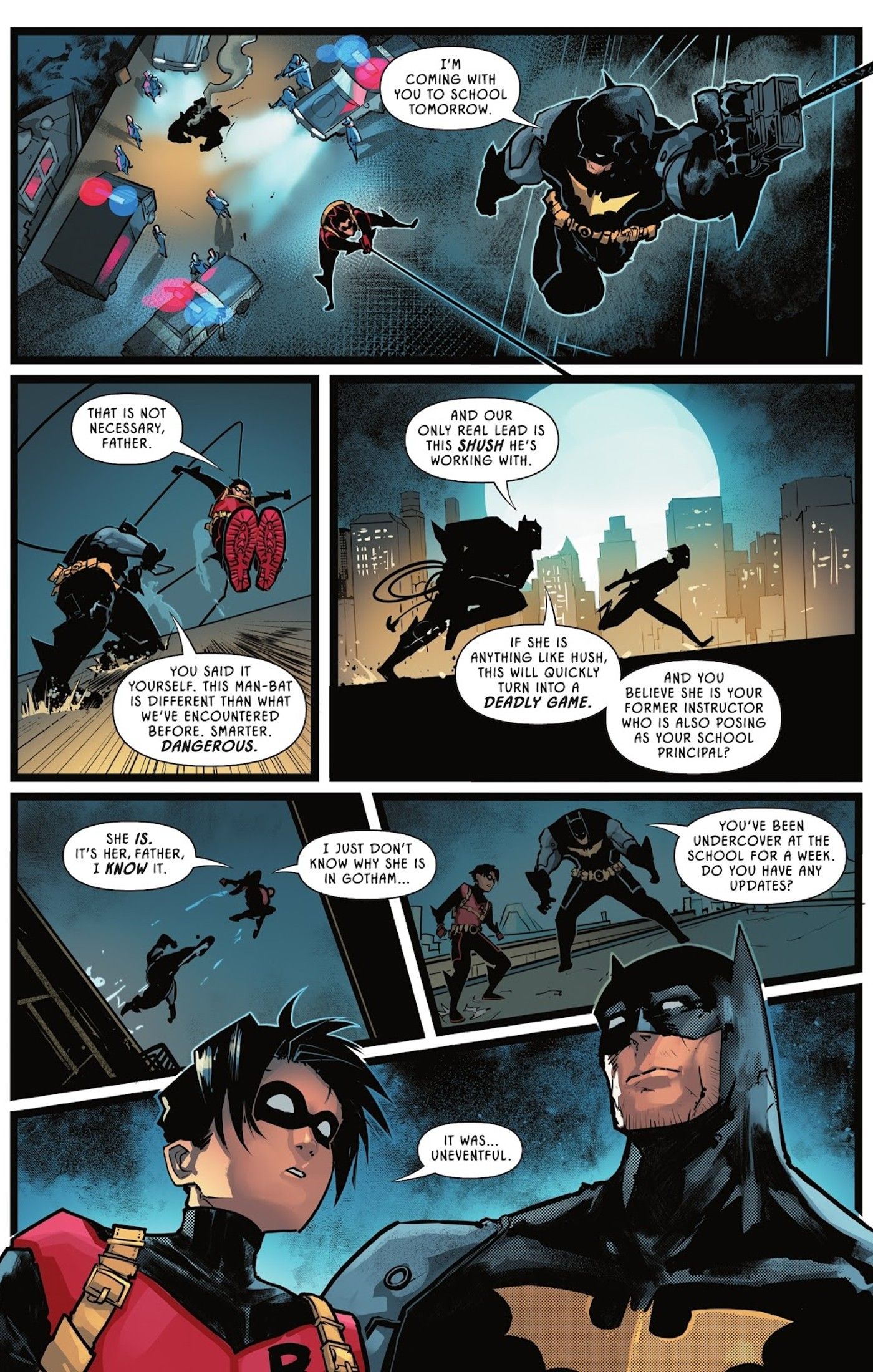 En el último número, Damian expresa que cree que es una pérdida de tiempo asistir a la escuela secundaria mientras Shush y Man-Bat todavía están ahí. Bruce admite lo mucho que significaría para él si Damian intentara tener una vida normal fuera de su vida nocturna de superhéroes. Damian no está contento con esa respuesta, pero en el número 5, Damian comienza a cambiar su tono cuando Bruce comienza a cambiar el suyo. Batman comienza a sugerir que en realidad envió a Robin a la escuela como parte de una misión encubierta.