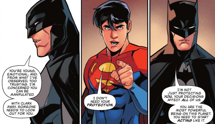 En Superman: Hijo de Kal-El # 11 de Tom Taylor, Cian Tormey, Federico Blee, Matt Herms y Dave Sharpe de DC Comics, Superman se enfrenta a Batman sobre su relación con el reportero de noticias clandestinas Jay Nakamura. The Caped Crusader explica que Nakamura está trabajando junto a The Revolutionaries, considerados extremistas violentos, pero Kent no está de acuerdo con la categorización. Batman menciona la debilidad secreta de Jon Kent, ya que lo llama “joven”, “emocional” y “demasiado confiado”. Expresa una gran preocupación acerca de que Superman pueda ser manipulado, ya que teme que alguien que tenga control sobre el ser más poderoso del planeta pueda tener graves consecuencias.