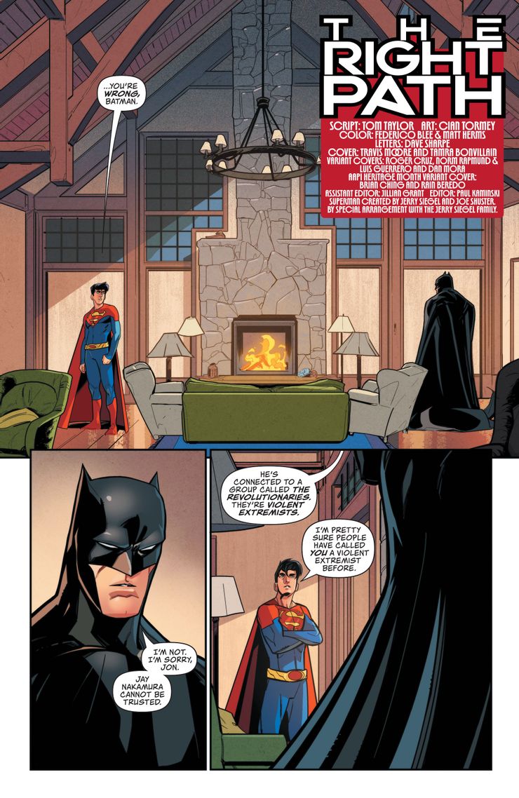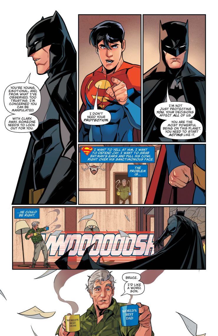 El nuevo Superhombre Jon Kent se ha encontrado en desacuerdo con hombre murciélago, y en su primer enfrentamiento con el cruzado con capa, se mantiene firme mejor que su padre. Justo cuando Jon se encontró en una relación feliz, Batman llegó a la ciudad para llover sobre su desfile. Si bien la mayoría en el universo de DC no se atrevería a acercarse a Bruce Wayne, Jon Kent retrocede a pesar de su miedo, dándole un gran momento destacado al principio de su carrera.