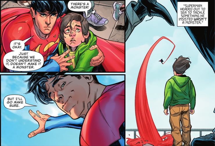 A pesar de que Bendix busca escalar la situación con el leviatán a su favor, Superman y Aquaman trabajan juntos para alejar suavemente a la confundida criatura de Metrópolis. Antes de esto, el nuevo Superman está en la ciudad propiamente dicha, salvando a un niño de los pies de una multitud asustada. Mientras que el niño tiene miedo del leviatán y comienza a llamarlo monstruo, Jon alienta la nueva perspectiva de que algo o alguien que no se entiende de inmediato no lo convierte en un monstruo, lo que motiva un cambio duradero en la perspectiva de la vida de este niño donde él podría no ser tan rápido para juzgar por miedo en el futuro.