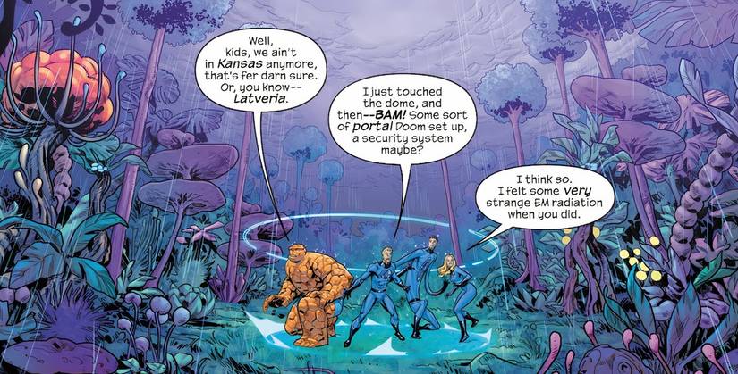 En Los cuatro fantásticos #25 de Ryan North, Carlos Gómez, Jesús Aburtov y Joe Caramagna, el equipo titular investiga una misteriosa cúpula en la que el Doctor Doom, el recién nombrado Hechicero Supremo de Marvel, ha encerrado a Latveria. Los Cuatro Fantásticos no pueden penetrarlo y, cuando la Antorcha Humana interactúa con él, todos se teletransportan a un lugar desconocido que evidentemente no es Latveria. Cuando Johnny dice que lo único que hizo fue tocar la cúpula, la Mujer Invisible hace una declaración que insinúa un sorprendente superpoder: “Sentí una radiación EM muy extraña cuando lo hiciste”.