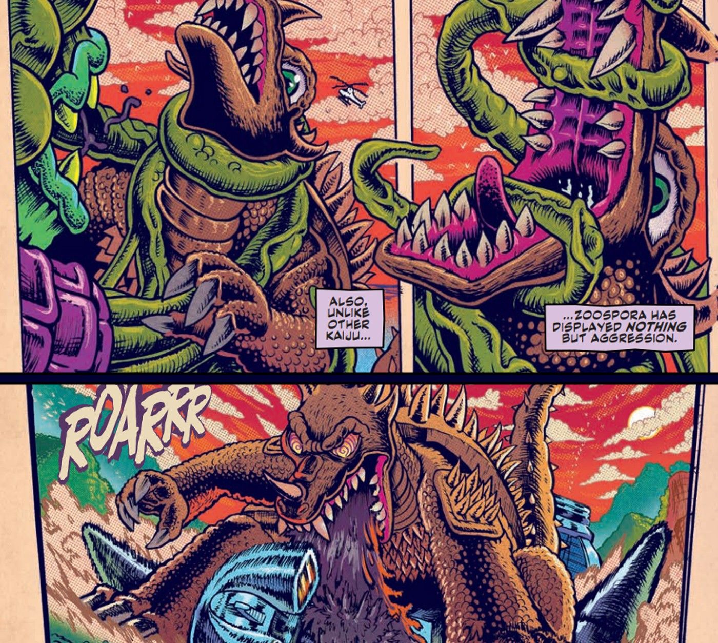 “/> Hasta ahora se desconocen el origen y los motivos de Zoospora, pero lo que los fanáticos sí saben es que Godzilla se niega a luchar contra ella. El número ofrece dos teorías sobre por qué, mientras diferentes facciones opinan sobre la presencia de Zoospora: o Godzilla aprueba que Zoospora extinga a la humanidad y ponga fin a su amenaza al mundo natural, o está demasiado preocupado por cuidar a su hijo Minilla como para unirse a la batalla. – una preocupación razonable, ya que Minilla ha sido el objetivo de otros Titanes en la historia hasta ahora. El problema termina con Mothra atacando a Godzilla, con la esperanza de atraerlo a la pelea. Sin embargo, puede que ya sea demasiado tarde: en este punto, Zoospora tiene un pequeño ejército de kaiju bajo su hechizo, y su biología única lo convierte en un rival físico incluso para el Rey de los Monstruos.