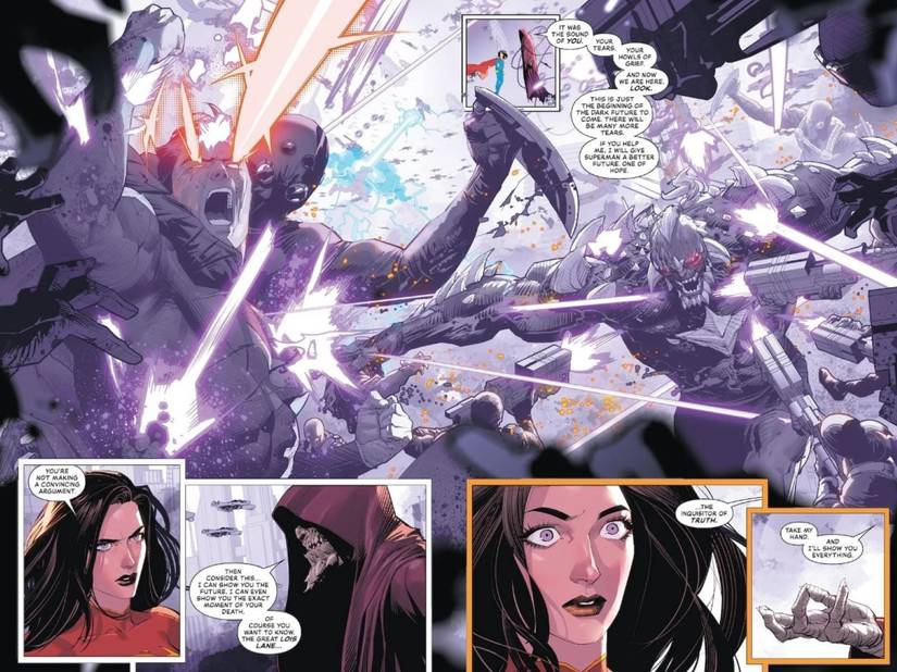 En este momento, congela el tiempo para hablar con Lois, intentando atraerla a una alianza, un acuerdo que Superman mismo ya ha rechazado. Para persuadirla Él se ofrece a darle una idea de su futuro, refiriéndose a ella como “El inquisidor de la verdad”—Un nombre que debería activar las alarmas para los lectores.