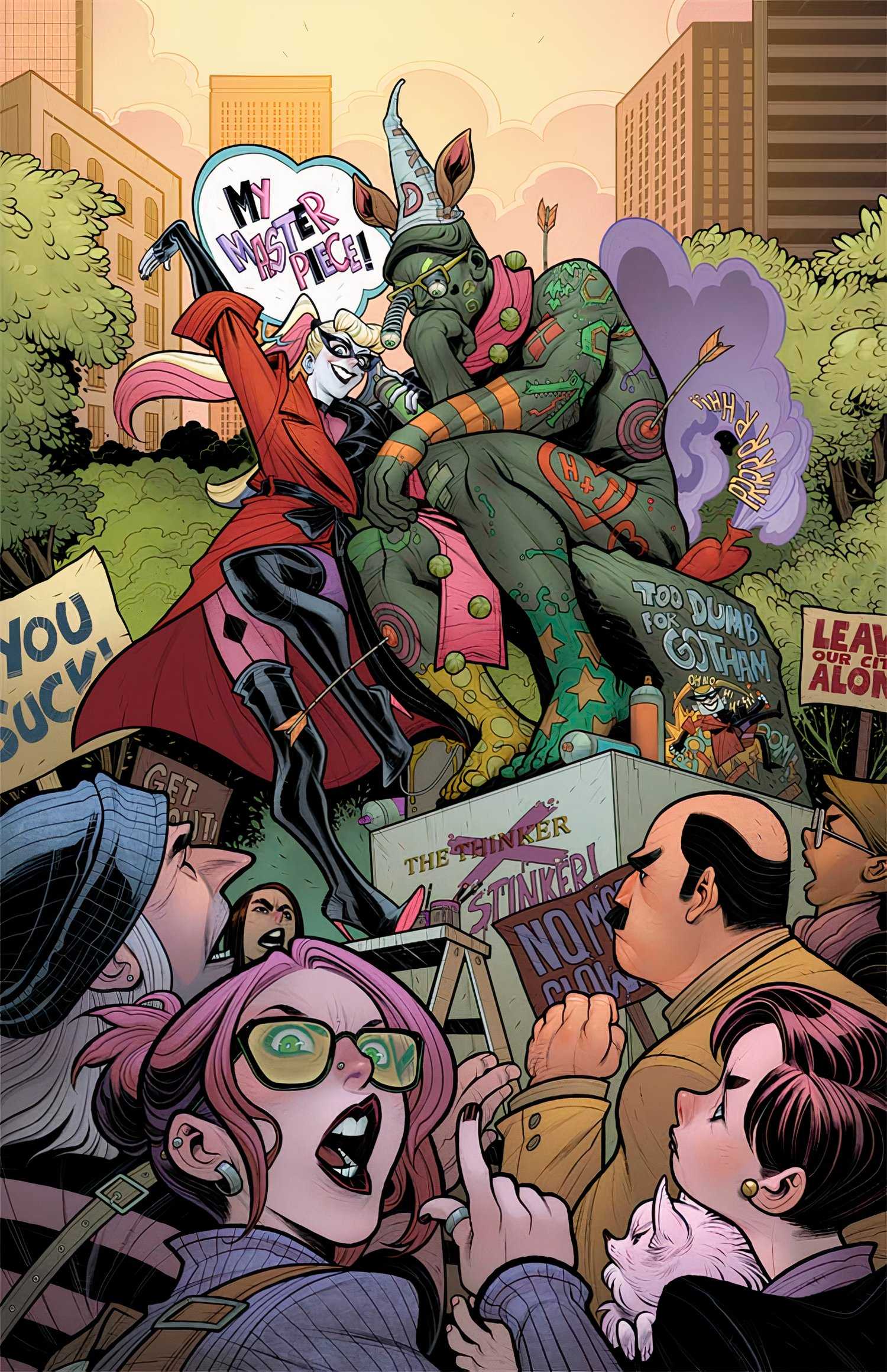 Este noviembre, Harley Quinn #45 En esta edición, el personaje principal crea la Agencia Destructiva Harley Quinn. En sus propias palabras, si alguien necesita que algo sea vandalizado o golpeado, Harley Quinn está lista para el desafío. La portada de Elizabeth Torque para la edición Muestra a Harley Quinn desfigurando la estatua del Pensador mientras un grupo de manifestantes la rodea..