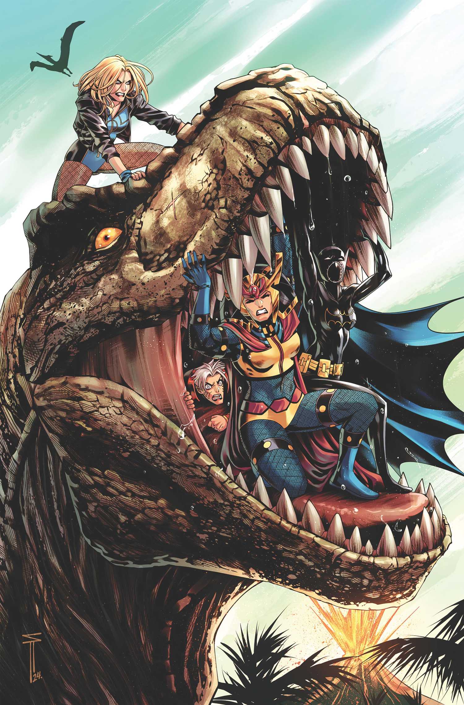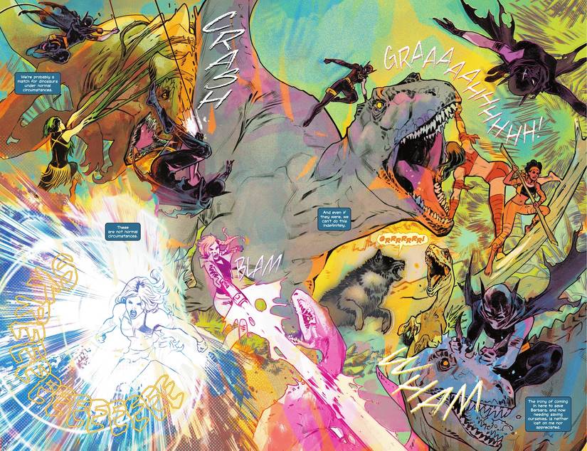 En Aves de presa #11 de Kelly Thompson, Javier Pina, Robbi Rodríguez y Gavin Guidry, los Pájaros aterrizan en un mundo nuevo y extraño, enfrentándose a una avalancha de animales que ni siquiera Vixen puede ver venir. Afortunadamente, la dimensión de bolsillo permite un cambio rápido de vestuario (para todos los Pájaros, Batgirl incluida) que se adapta mejor al entorno y a su situación actual, que es, por supuesto, patear dinosaurios.