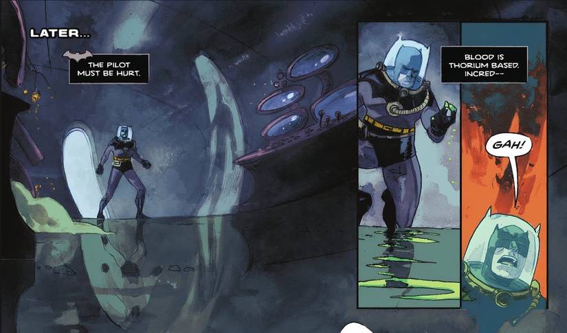 Sin embargo, al llegar al lugar del accidente, el equipo de Bruce detecta altos niveles de material radiactivo, lo que le llevó a ponerse algo “.costumbre.” Resulta ser un traje de materiales peligrosos con temática de Batman que tiene un parecido sorprendente con el traje criogénico del Sr. Freeze.