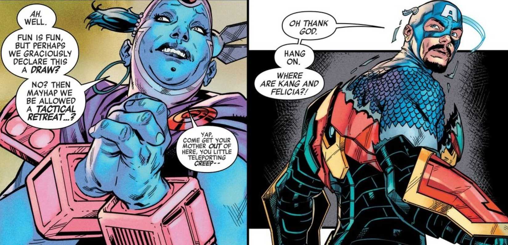 Si bien este visual es hilarante, también es un momento sutil de caracterización para Iron Man. Tony a menudo se define por su culpa. No siente que pueda estar a la altura de los ideales heroicos de sus compañeros, y es consciente de cuán egoísta y autodestructiva puede ser. Por supuesto, Luego desea que fuera más como el Capitán América, moralmente directo y seguro de sí mismo en todo lo que hace. Si CAP realmente se siente así es irrelevante; Es cómo Tony ve el idealismo y la fuerza de la voluntad de Cap en comparación con él mismo.