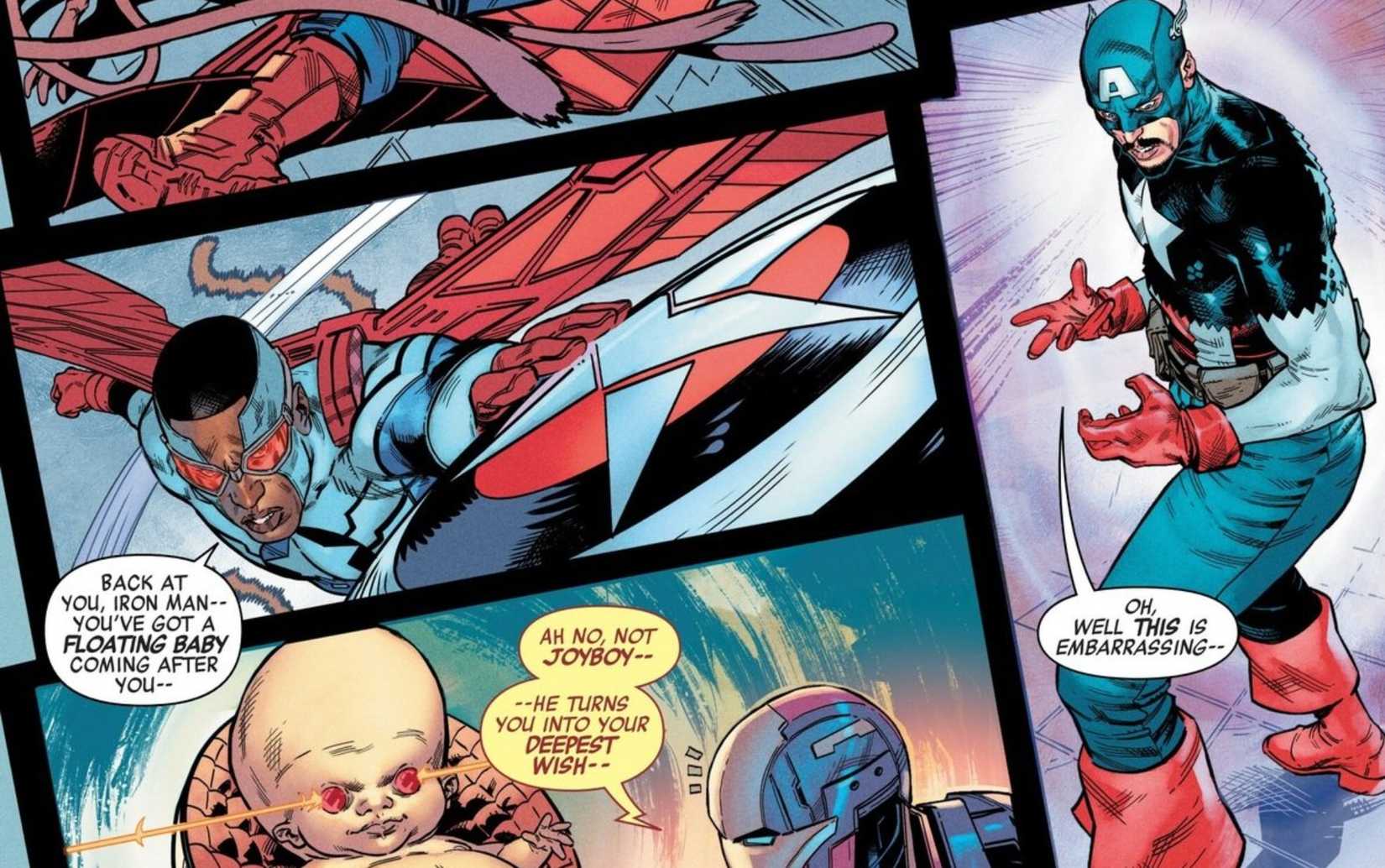 El problema ve a los Vengadores enfrentarse a la clásica cazadores de recompensas de Marvel Alien, incluido Joyboy, un alienígena que puede otorgar el deseo más profundo de alguien, pero con el toque de tipo de pata de un mono. Iron Man, por lo tanto, llega a ser un gran héroe como la gorra, pero pierde su armadura por el clásico disfraz de tela de Cap.