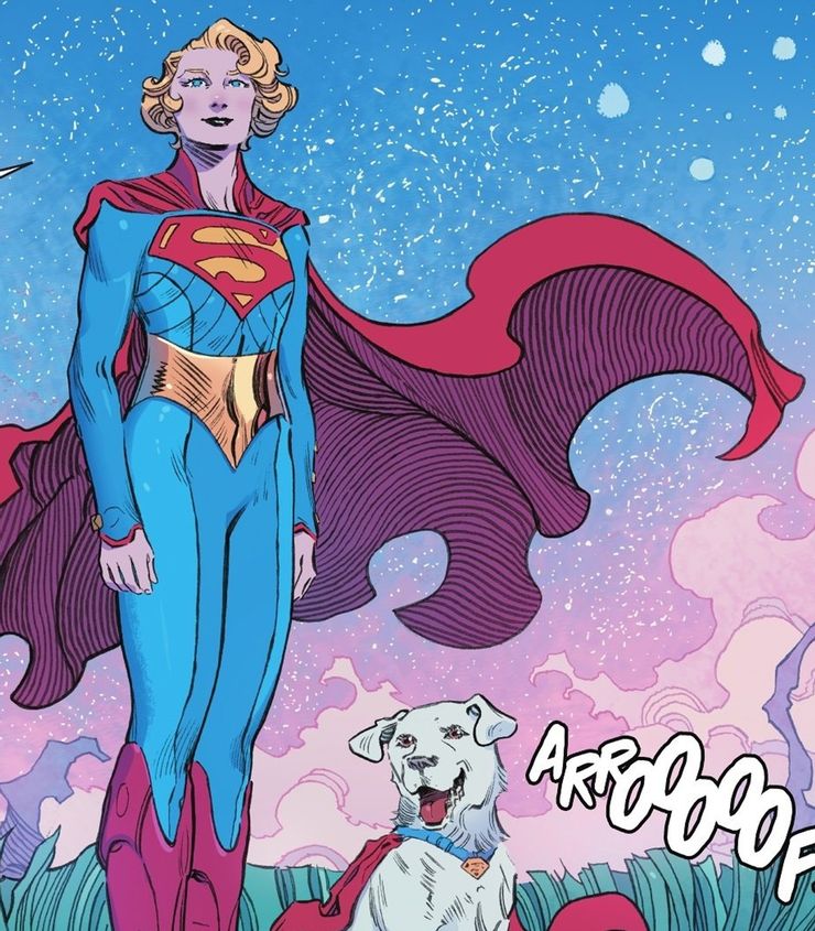 En el último número de Supergirl: mujer del mañana por Tom King y Bilquis Evely, Supergirl luce una nueva apariencia a medida que el libro avanza hacia el futuro. La serie termina décadas en el futuro cuando Supergirl visita a una anciana Ruthye. Aquí, Supergirl se ve completamente revitalizada y más como la Supermujer en la que se convirtió durante la Estado futuro evento. Se deshizo de su falda icónica y optó por pantalones azules con botas rojas. El disfraz aún conserva la faja dorada de Supergirl de su traje anterior, que junto con el esquema de color azul y rojo es todo lo que permanece igual. Además, la capa roja va más arriba de su cuello que antes.