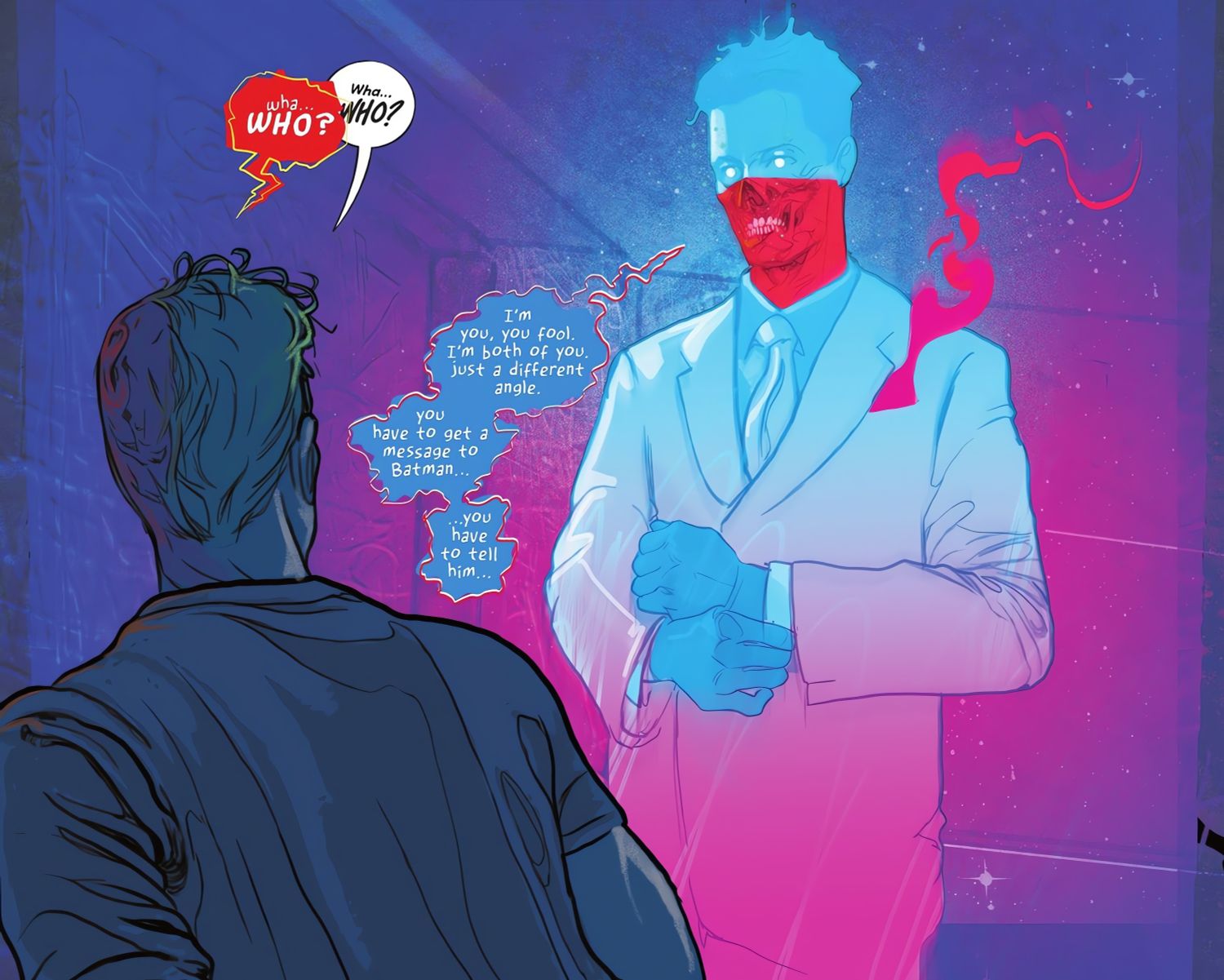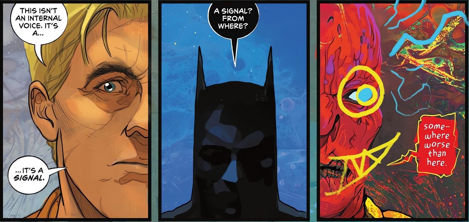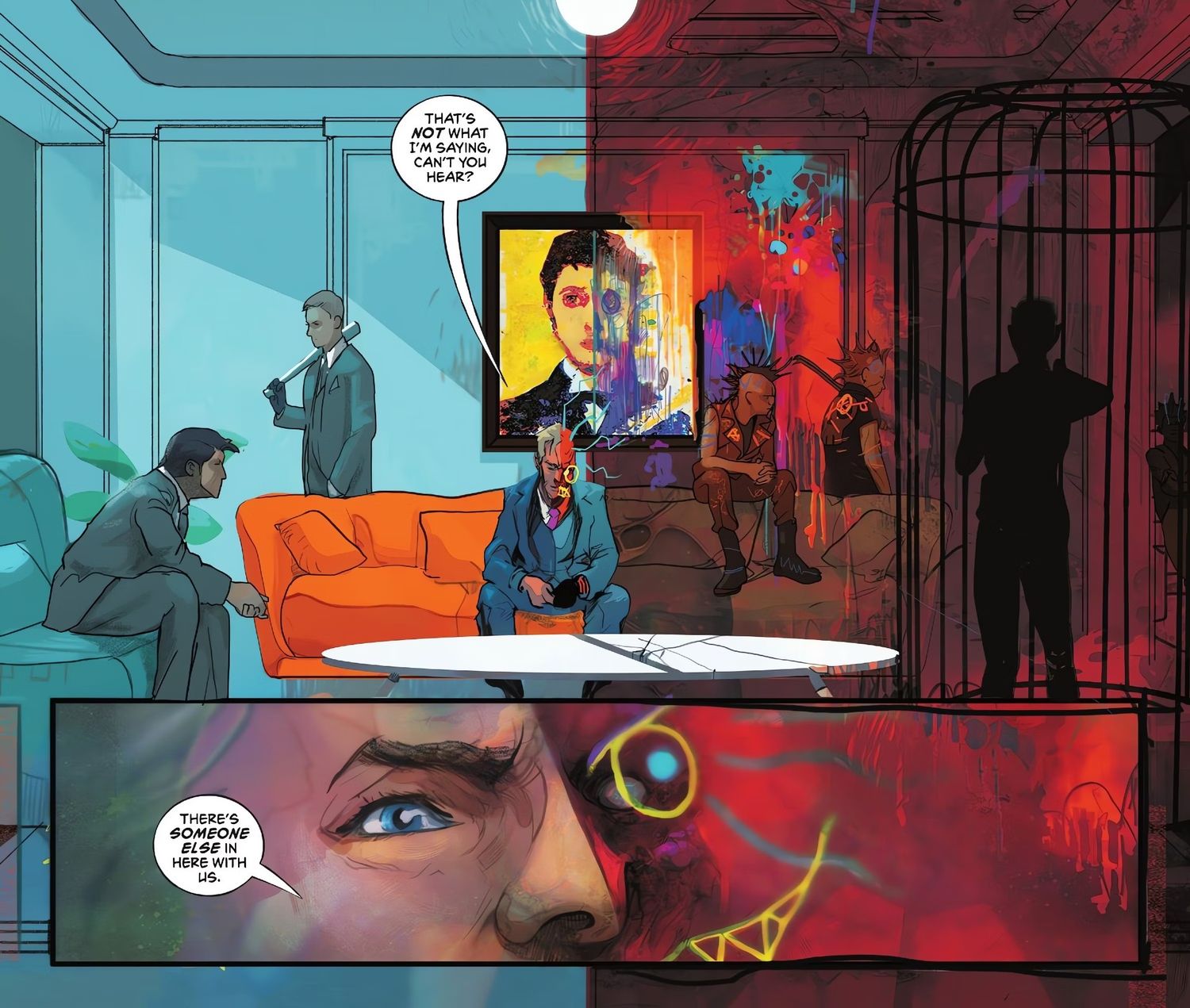 Después de que una confrontación con Batman lleva al regreso de Harvey a Arkham Asylum, le dice al Caped Crusader que lo que está escuchando no proviene de sí mismo, sino de “en algún lugar peor que aquí“.