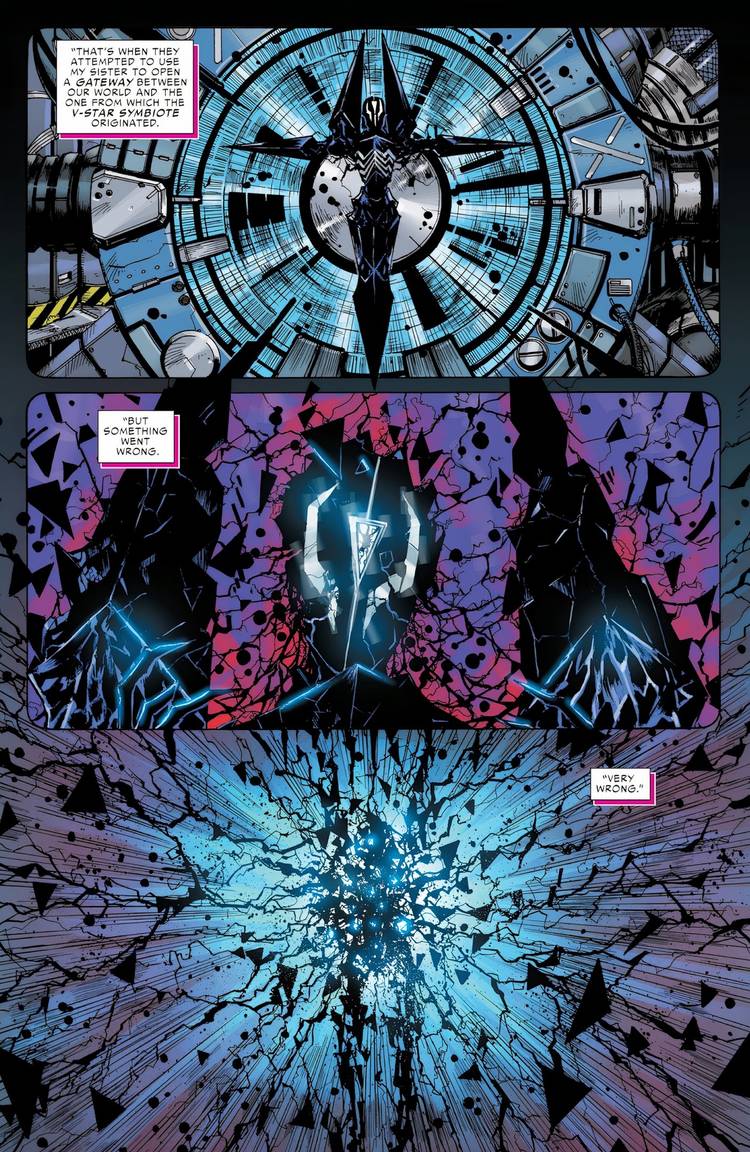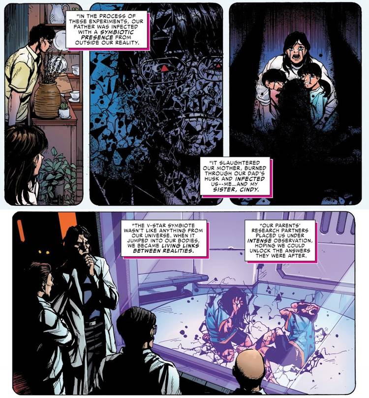 Resulta que la versión de Venom de este universo no es Eddie Brock, sino Cindy Moon. Habiendo sido experimentado por el villano Proyecto V-Star, El simbionte de Venom fue sacado de una realidad exterior e infectó a toda la familia de Cindy Moon.matando a su madre y a su padre antes de contagiar a ella y a su hermano. Para aliviar el sufrimiento de su hermano, Cindy absorbe la mayor parte del simbionte, transformándose en algo que los lectores nunca antes habían visto.