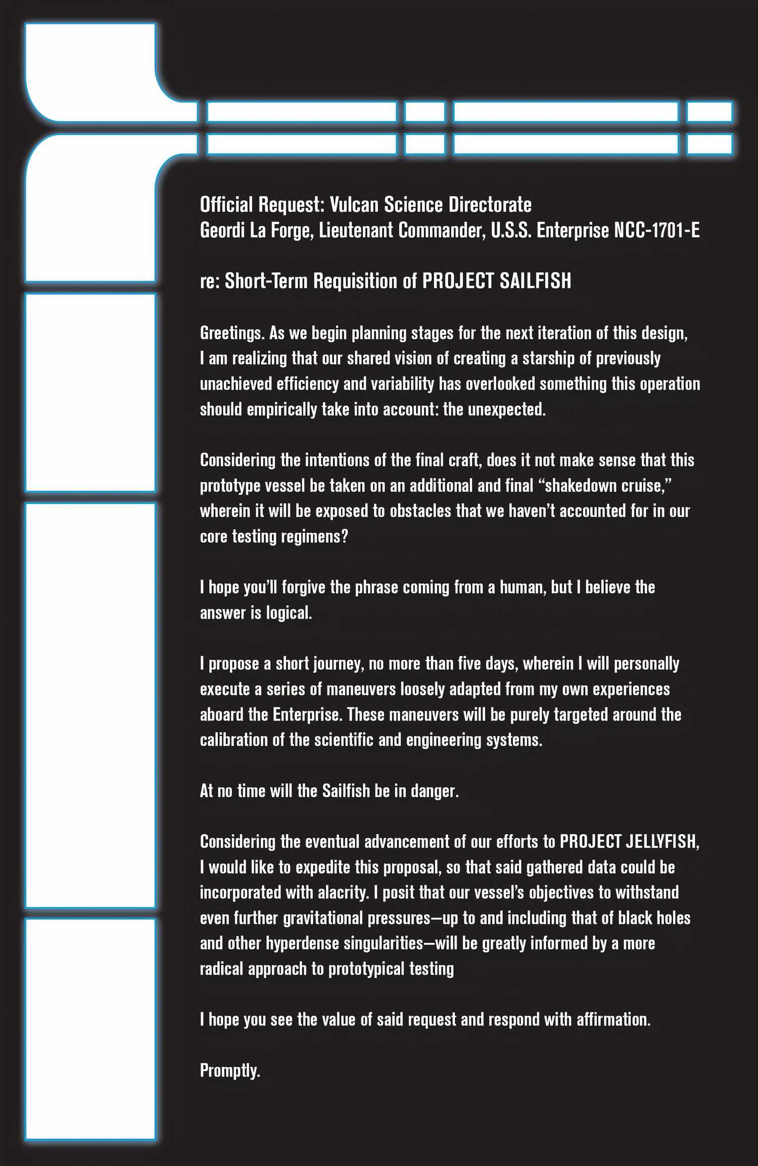 Un fragmento de texto, diseñado para parecerse a una reunión informativa de la Flota Estelar, revela la Pez vela es el nuevo proyecto personal de La Forge, y es un prototipo de una embarcación más avanzada, todavía en la mesa de dibujo: la Medusa.
