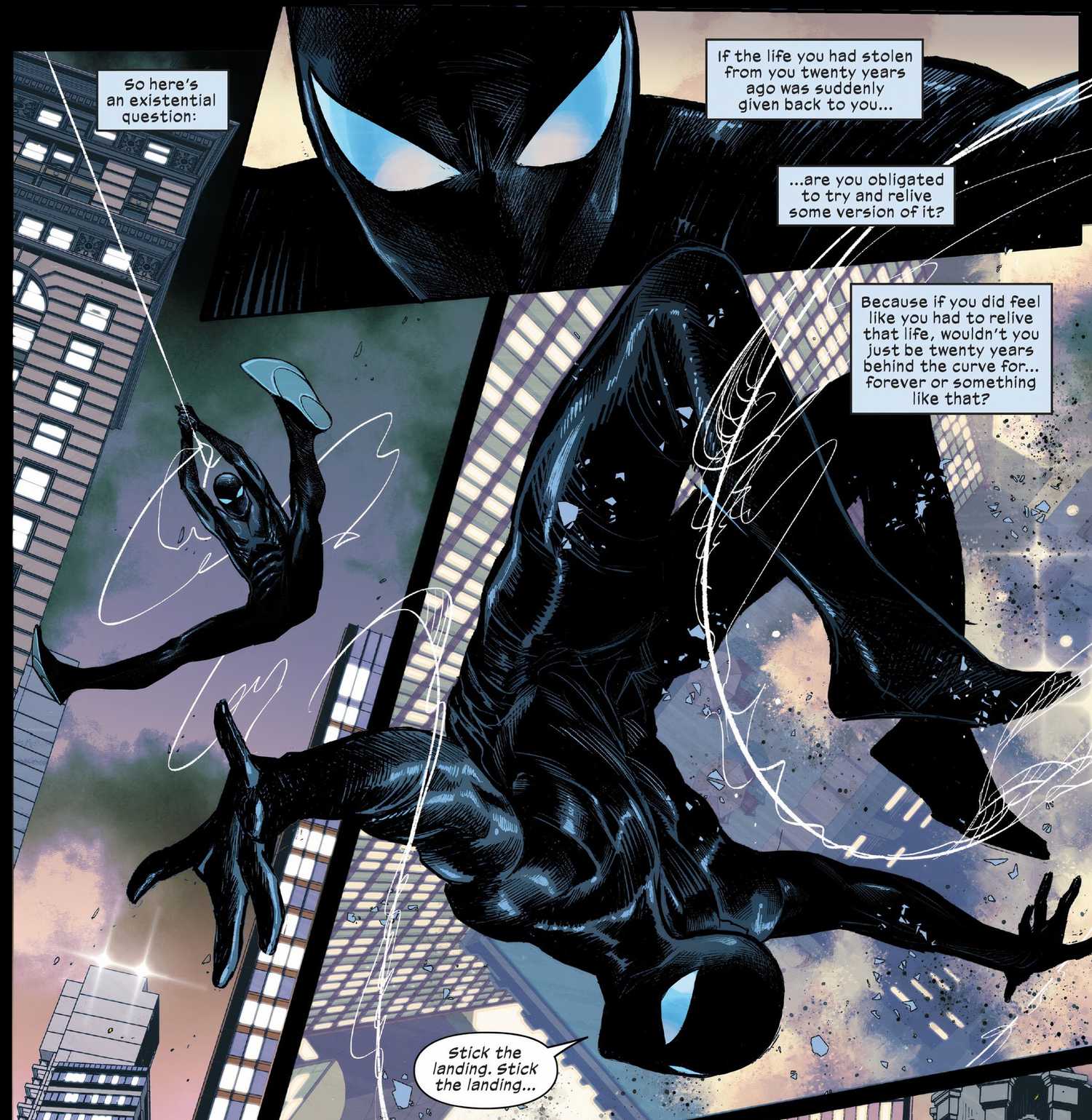 Las características visuales distintivas de Venom se han introducido en el nuevo El último Hombre Araña serie desde el principio, pero han sido astutamente ocultas en segundo plano a medida que se desarrollan la historia y lo que está en juego. Sin embargo, lo más notable es cómo el traje de Peter habla con el globo de diálogo tradicional de Venom y con la voz de Peter. Esto nos recuerda el deseo inicial del simbionte de Venom de vincularse completamente con Peter, ya que la conciencia del simbionte y la conciencia de Peter siempre han estado estrechamente entrelazadas. Los desarrollos en El último Hombre Araña #7 preparó a Venom para que fuera la impronta de IA de Peter que se volvió rebelde.