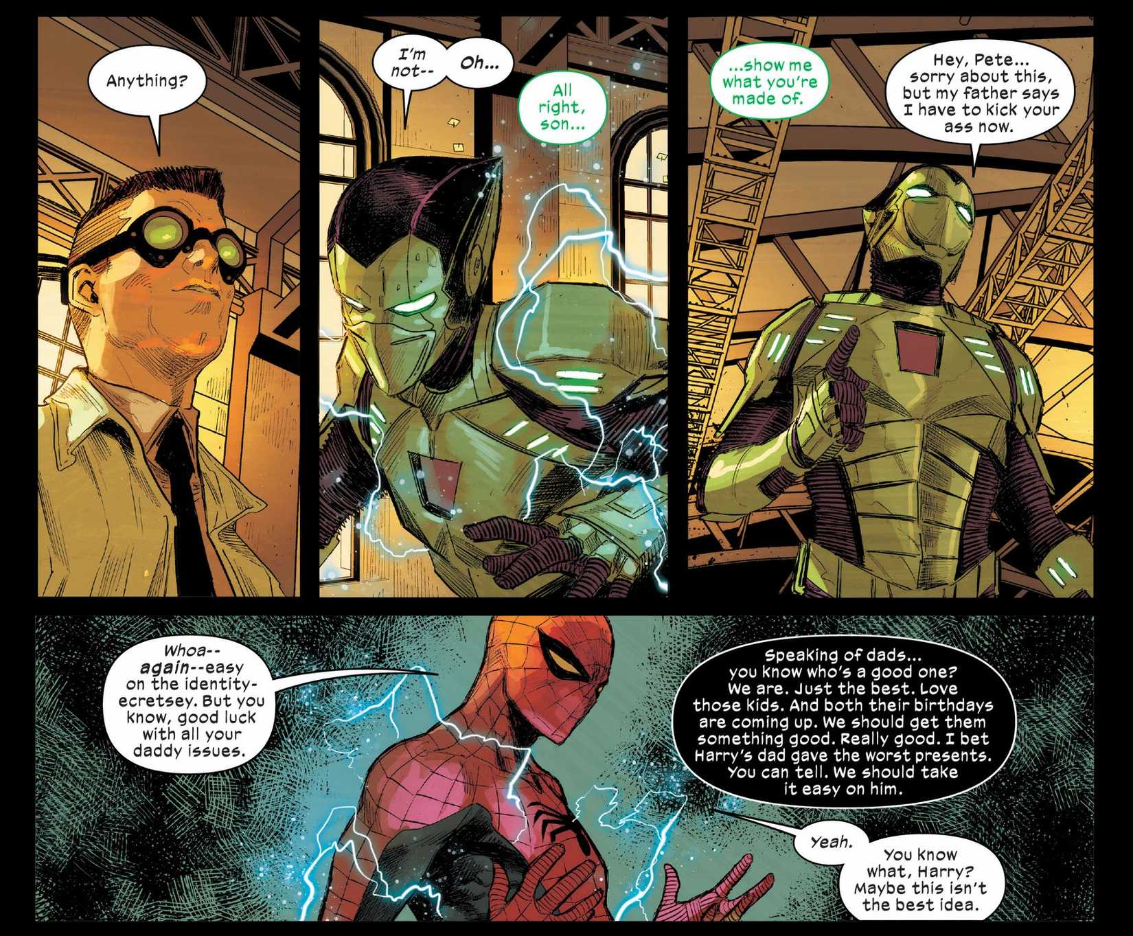 El último Hombre Araña En el número 7, escrito por Jonathan Hickman y con ilustraciones de Marco Checchetto, Peter Parker, Harry Osborne y Otto Octavius se reunieron para probar sus trajes basados en la tecnología Stark. Mientras que Otto describe el traje picotecnológico de Peter como “Más allá del hardware“La tarea principal del día es probar la inteligencia artificial a bordo del traje.