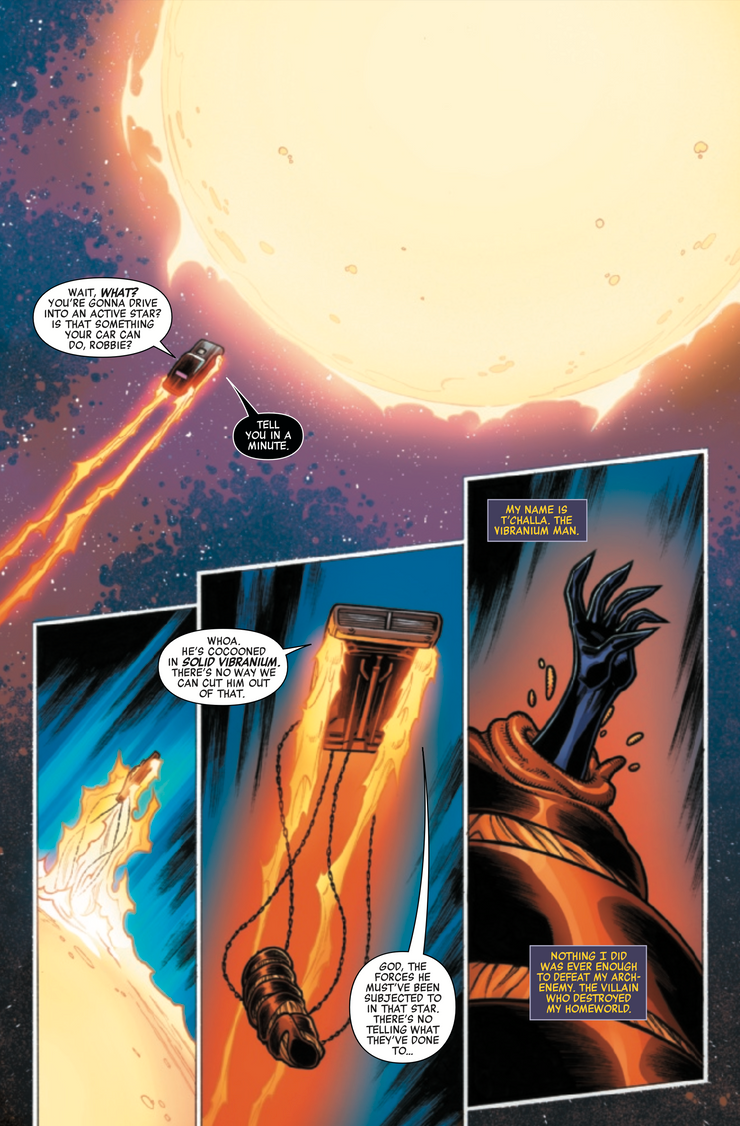 En Vengadores para siempre #3, escrito por Jason Aaron con arte de Jim Towe y Guru-eFX, T’Challa es el Vibranium Man, que combina elementos de Superman, Spider-Man Star-Lord para convertirse en Star-Panther, una variante increíblemente poderosa que creó un traje de poder. de armadura hecha de vibranium (también convirtiéndose en la versión del universo de Iron Man). Durante una batalla climática con Killmonger, T’Challa es arrojado por su enemigo directamente a una estrella. Días después, los Vengadores multiversales localizan a T’Challa, envuelto en un capullo de “vibranio puro” que evidentemente ha protegido a su portador del inmenso calor y la gravedad de un sol.