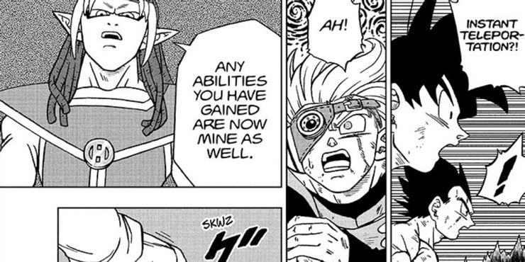 Como se reveló en el capítulo 79 de Dragon Ball Super, Gas puede manejar la Transmisión instantánea de Goku y la Destrucción de Vegeta al igual que la habilidad de copia de Moro.