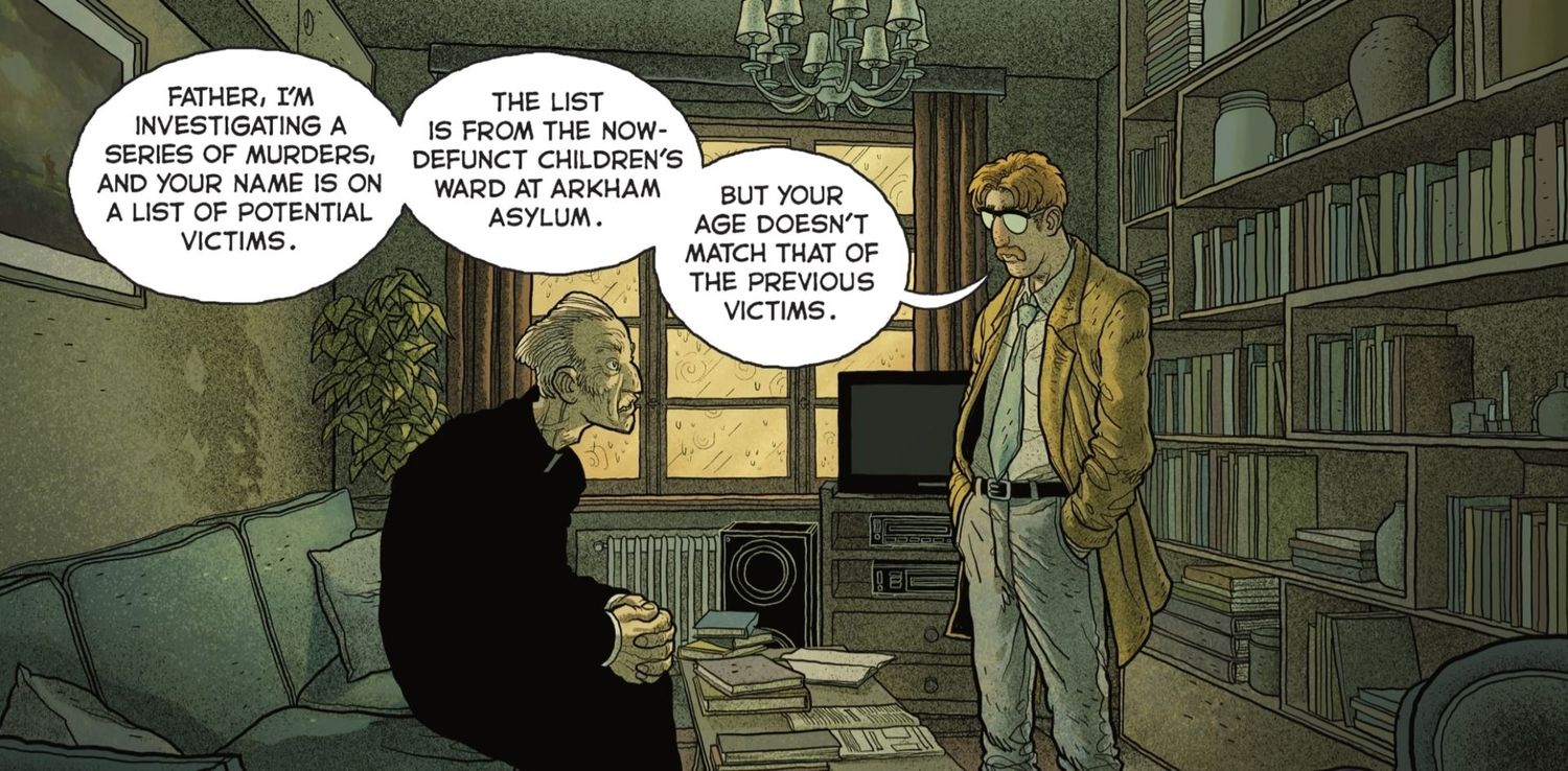 En Batman: Gárgola de Gotham #2 Por Rafael Grampa con Mat Lopes, el detective Gordon continúa rastreando a un asesino en serie en Gotham y cree que cualquiera que haya sido tratado por el psiquiatra de Arkham Asylum, el Dr. Charles Quinton, está en riesgo. Gordon visita a una víctima potencial, un sacerdote local llamado Vincent Strasbourg III.