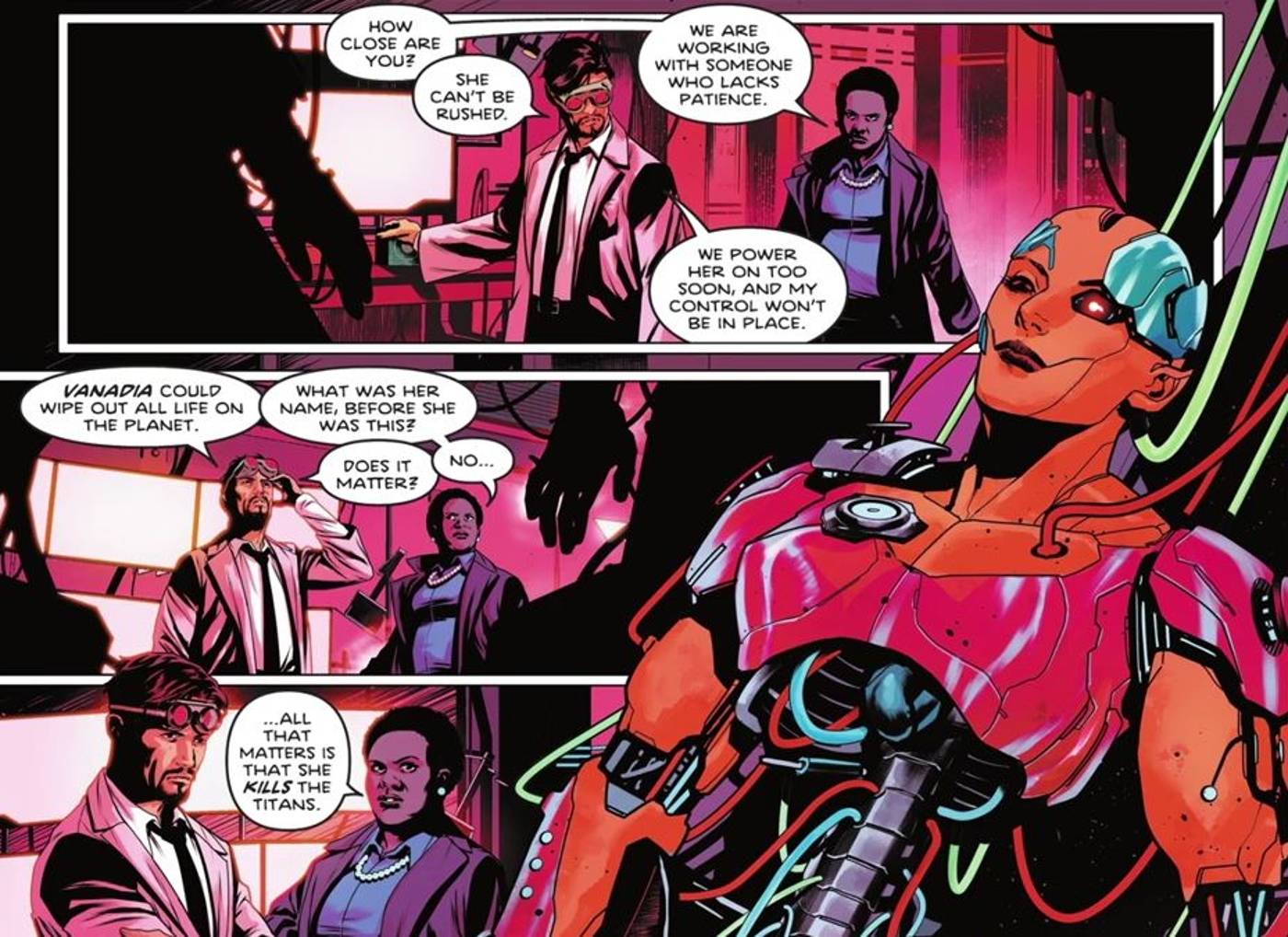 Los Titanes logran salvar a los manifestantes mientras la malvada Raven se ocupa de su hermano. Mientras se lleva a Trilogy, Nightwing comienza a sospechar del comportamiento de Raven. En otro lugar no revelado, Amanda Waller observa al Dr. TO Morrow, quien está reconstruyendo cuidadosamente una Caja Madre mientras trabaja en su última creación. Waller quiere que Morrow termine su nuevo proyecto, un cyborg llamado Vanadia, para que Waller pueda usarlo para matar a los Titanes. Pero Morrow enfatiza la importancia de garantizar que su robot se cree correctamente como lo haría Vanadia “acabar con toda la vida en el planeta”.