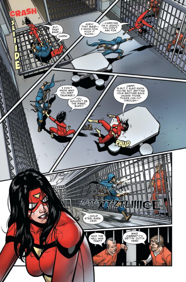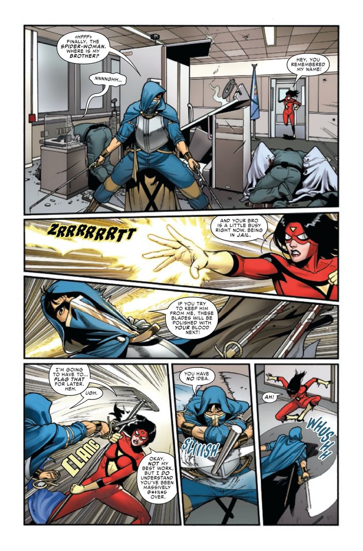 Cuando se abre la vista previa, se llama a Spider-Woman para que se haga cargo de la mitad de Los Espadas Gemelas, dos hermanos criminales con los que se había enredado anteriormente. Ella puso a uno de los hermanos en la cárcel, y ahora el otro lo va a sacar. Mientras él y Spider-Woman intercambian golpes, ella mantiene un flujo de diálogo sin parar, lo que lo lleva a preguntarle si alguna vez deja de hablar. Ella responde que él no sería el primero en hacer esa pregunta. Él es capaz de dominarla, someterla y romper las celdas de la cárcel. Consulte las páginas de vista previa a continuación.