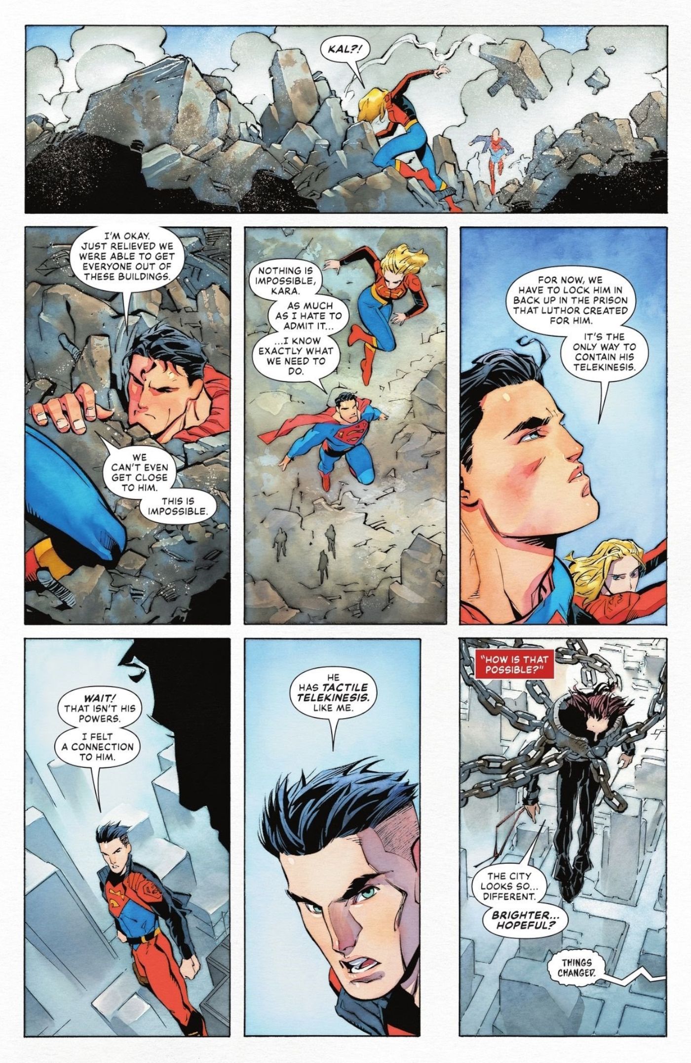 - A pesar de los esfuerzos de la Superfamilia, Superman está luchando por contener los poderes de los Encadenados, mientras usa su telequinesis táctil para mantenerse al día con ellos, demostrando ser una amenaza formidable.