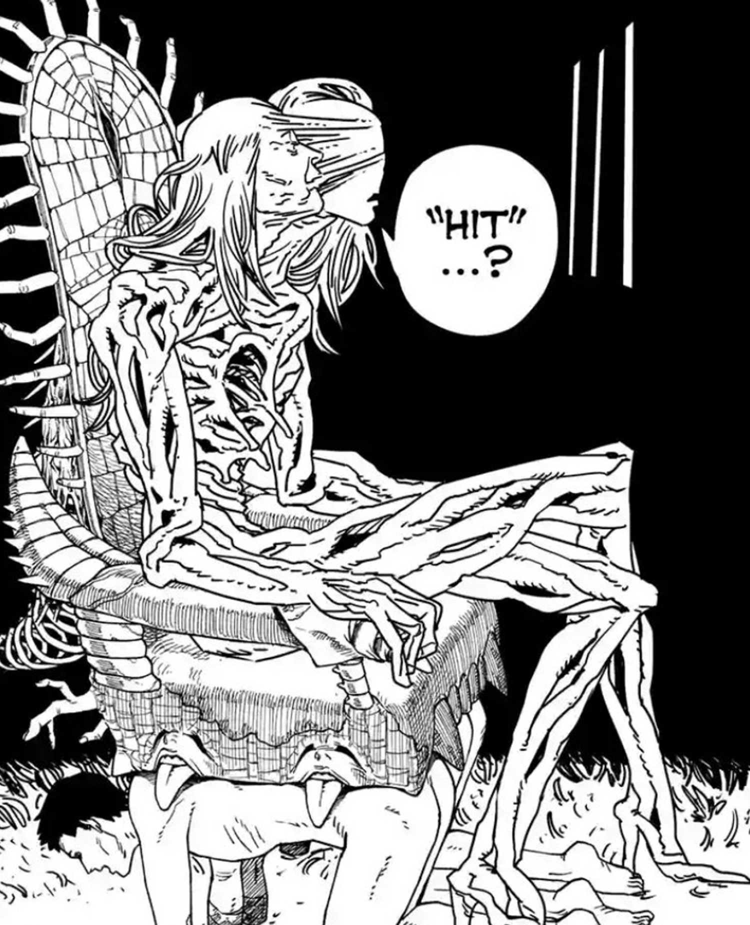 Una vez que se confirmó que el Demonio de la Oreja fue consumido por el Héroe del Infierno, tres agentes de Seguridad Pública les cortaron los dedos y los usaron para escribir la palabra “HIT” en un espejo. Un demonio que estaba sentado en un trono llevado por dos hombres desnudos vio el mensaje y atacó a Pochita con un puño, pero no pudo contenerlo y perdió tres dedos en el proceso. Sin embargo, Yoshida salvó el día milagrosamente y obligó a Pochita a vomitar al Demonio de la Oreja, devolviendo la audición a todo el mundo.