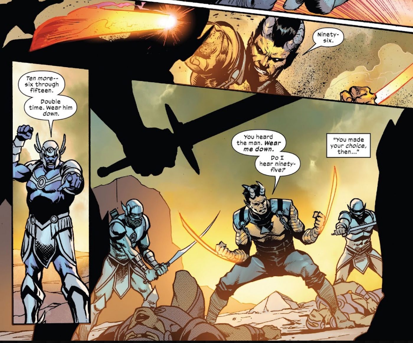 Al demostrar por qué era el mejor soldado de Sword, Ironfire atraviesa a sus antiguos aliados con facilidad. Y en el proceso, gana las rayas de Wolverine que alguna vez pertenecieron a Logan.