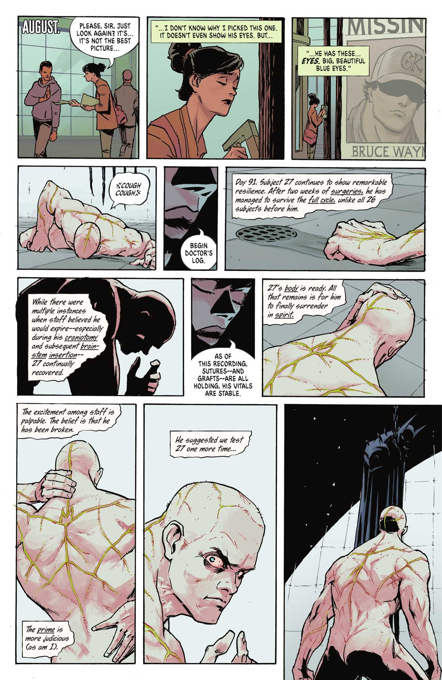 El día 91 de su cautiverio, el doctor Arkham registra el en curso de Bruce “progreso,” señalando que después de dos semanas de cirugías, Bruce ha logrado sobrevivir al ciclo completo, algo que ninguno de los 26 sujetos anteriores podría hacer. Entre los procedimientos que sufrió se encontraban una craneotomía y una inserción del tronco encefálico, los cuales fueron extremadamente riesgosos y dolorosos.