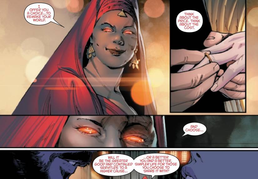 En DIOSES #8 de Jonathan Hickman y Valerio Schiti, al personaje principal Wyn se le ofrece la oportunidad de cambiar su historia. Si bien los lectores no pueden ver su elección, Se insinúa fuertemente que Wyn acepta, alterando así el Universo Marvel..