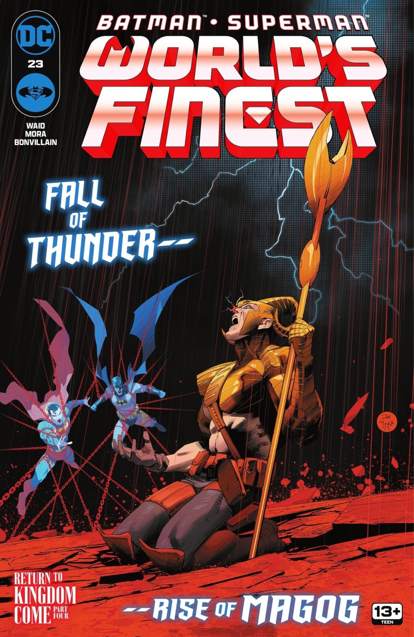 Batman/Superman: los mejores del mundo #23, de Mark Waid y Dan Mora, continúa la serie de cinco partes. Heredero del Reino arco de la historia, donde el Cruzado Enmascarado y el Hombre de Acero se encuentran arrojados al mundo de Venga el reino, uno de los Elseworlds favorito de los fanáticos. En esta entrega, los dos héroes, junto con la Liga de la Justicia de la Tierra alternativa, se unen para evitar que Darkseid obtenga la otra mitad de la Ecuación Anti-Vida.