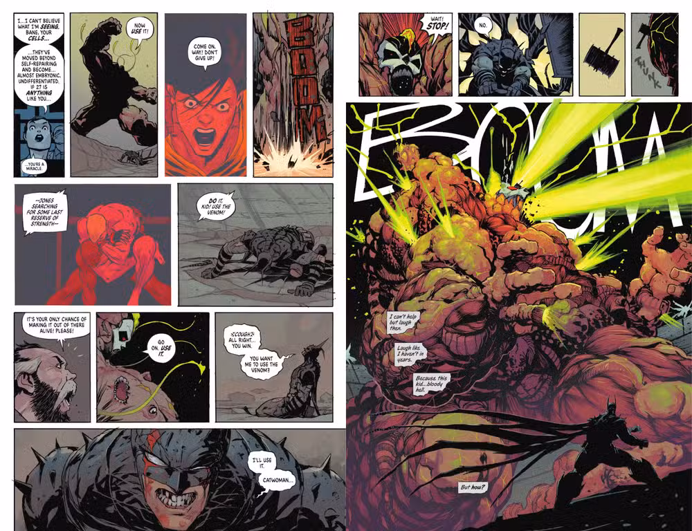 En lugar de fortalecerse, Batman hace que Catwoman le inyecte a Bane su dosis de Venom, lo que hace que el villano explote al sobrecargar su sistema ya al máximo. Es tan brillante como súper asqueroso, y al mismo tiempo demuestra que Batman está decidido a luchar en sus términos.