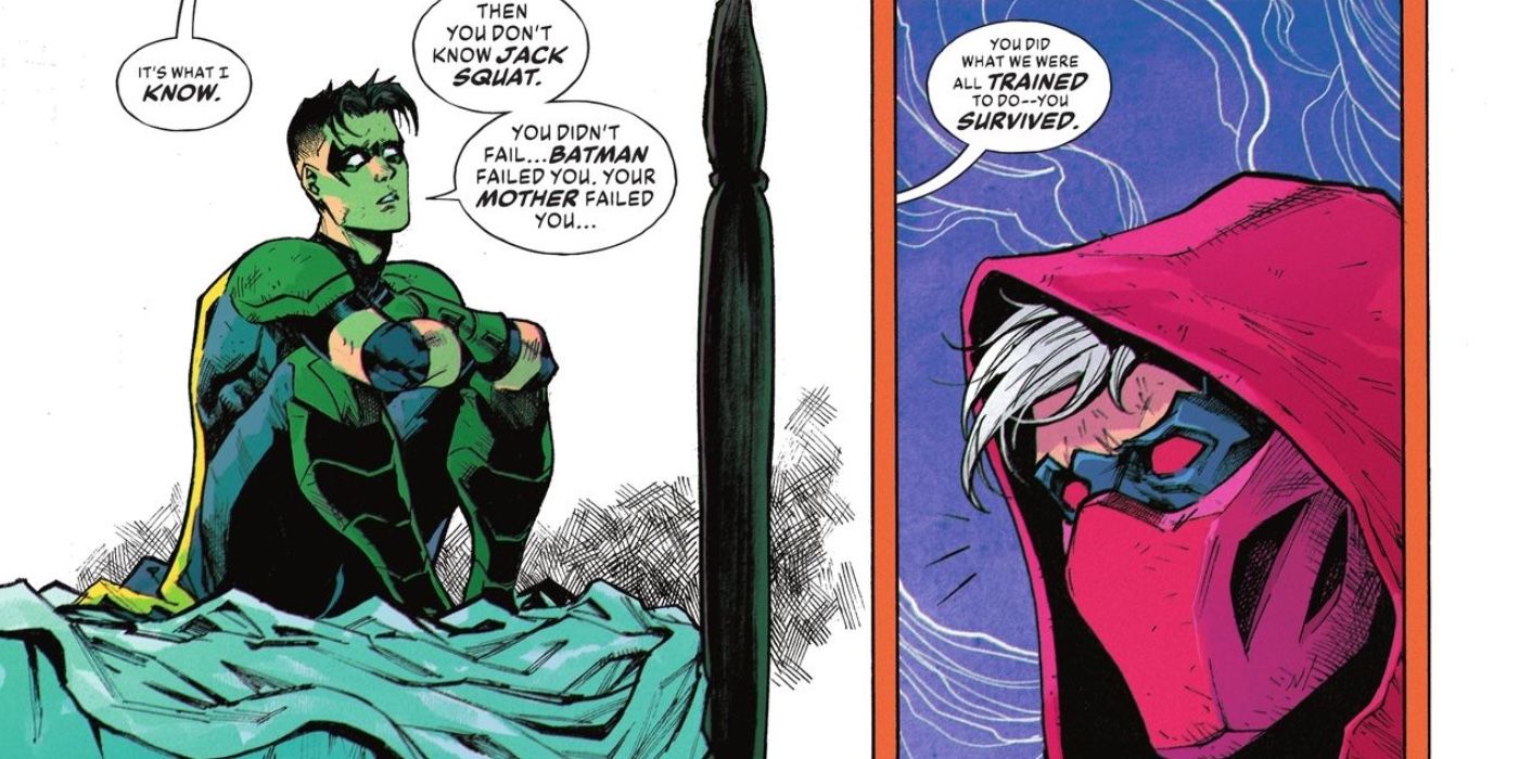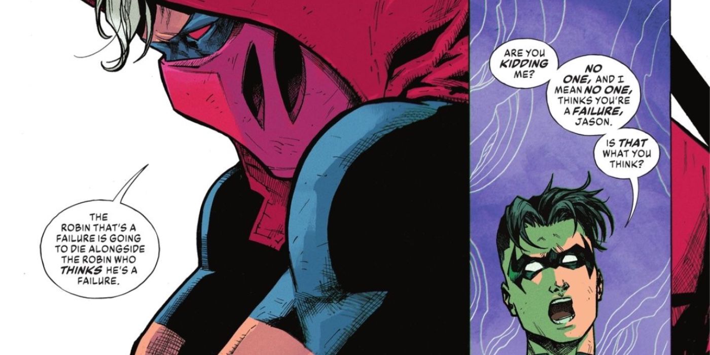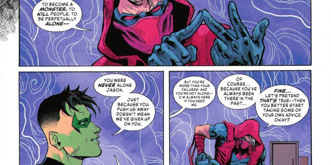 Todavía tratando de luchar contra esta verdad, que su muerte como Robin no fue su fracaso, Jason saca a relucir la brutal historia de su regreso a Red Hood para tratar de convencer a Tim de que todavía lo ha arruinado como persona, y Tim lo devuelve. diciéndole a Jason que, si bien definitivamente tiene mucho que expiar, todavía es más que sus peores errores. Ayudando a Jason a superar estos pensamientos oscuros, los comentarios de Tim aún no cambian el hecho de que la concepción errónea de Jason sobre su muerte y la lucha posterior de años para verse a sí mismo como algo más que un fracaso es una triste nota a pie de página para un personaje que tiene más apoyo que le importa admitir.