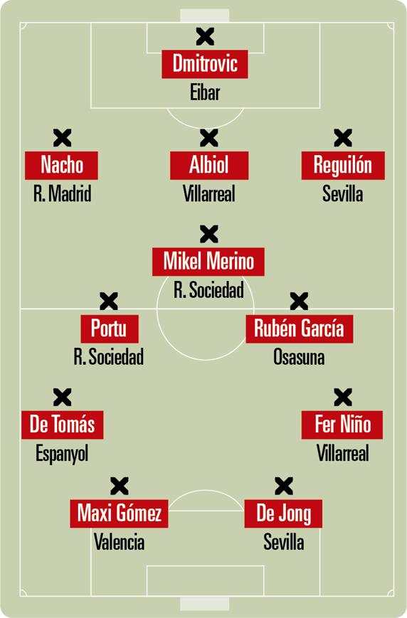 El único con doblete es Maxi Gómez, pero los goles de otros delanteros como De Jong, De Tomás y Fer Niño fueron claves en el resultado de sus equipos y están presentes en el ‘once’ ideal de la jornada 21 de LaLiga.