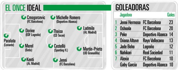 Centro del campo con bandas para Jenni Hermoso, que anotó un hat-trick en la goleada del Barça al Madrid CFF y se posiciona como ‘Pichichi’ en solitario con 23 goles, y para Michelle Romero, que fue una de las piezas clave en la heroica remontada del Deportivo ante el CD Tacon (3-4) en los últimos 10 minutos con doblete. Sandra Castelló y Thaisa completan la línea de cuatro. La primera anotó el valioso gol del empate para el Sporting que le saca de puestos de descenso, mientras que Thaisa fue la mejor jugadora del CD Tacon. Hasta que ella estuvo en el campo, su equipo controló el partido.