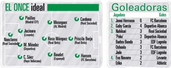 Camila Sáez vuelve a repetir en el lateral gracias a su sobriedad defensiva, a la que sumó un gol que dio la victoria Rayo Vallecano. La acompaña la joven Itziar Pinillos, cuya disciplina paró a una de las estrellas del CD Tacon, Jakobsson. Completan la defensa como pareja de centrales María Méndez, que abrió la lata en Lezama para permitir al Depor seguir colíder, y Jucinara, de quien salió la asistencia a Eva Navarro que supuso el triunfo del Levante.