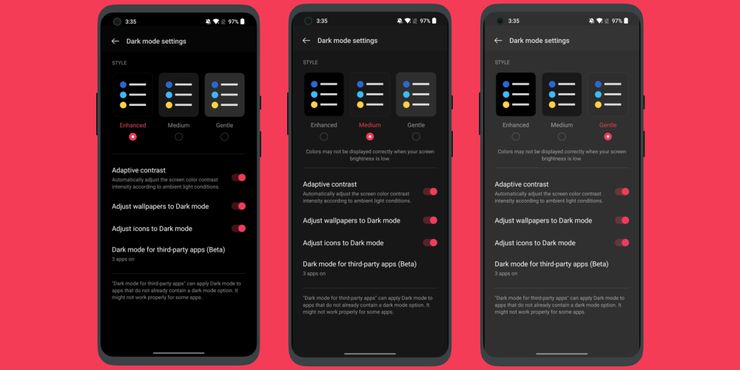 Pero algunas personas pueden encontrar que Mejorado es un poco también contrastante para sus ojos. Si ese es el caso, Medio y Suave cambian el fondo completamente negro a un gris más claro. Los tres modos se ven geniales por derecho propio. Enhanced es elegante y sigiloso, Gentle es ideal para las noches cuando te estás relajando, y Medium logra un equilibrio perfecto justo en el medio. ¡Y puedes llevar la personalización aún más lejos! Debajo de los estilos de modo oscuro hay algunas otras opciones. OnePlus permite a los usuarios controlar cómo reaccionan el fondo de pantalla y los íconos de aplicaciones al modo oscuro, cómo cambia el contraste del modo oscuro en diferentes condiciones de luz y más.