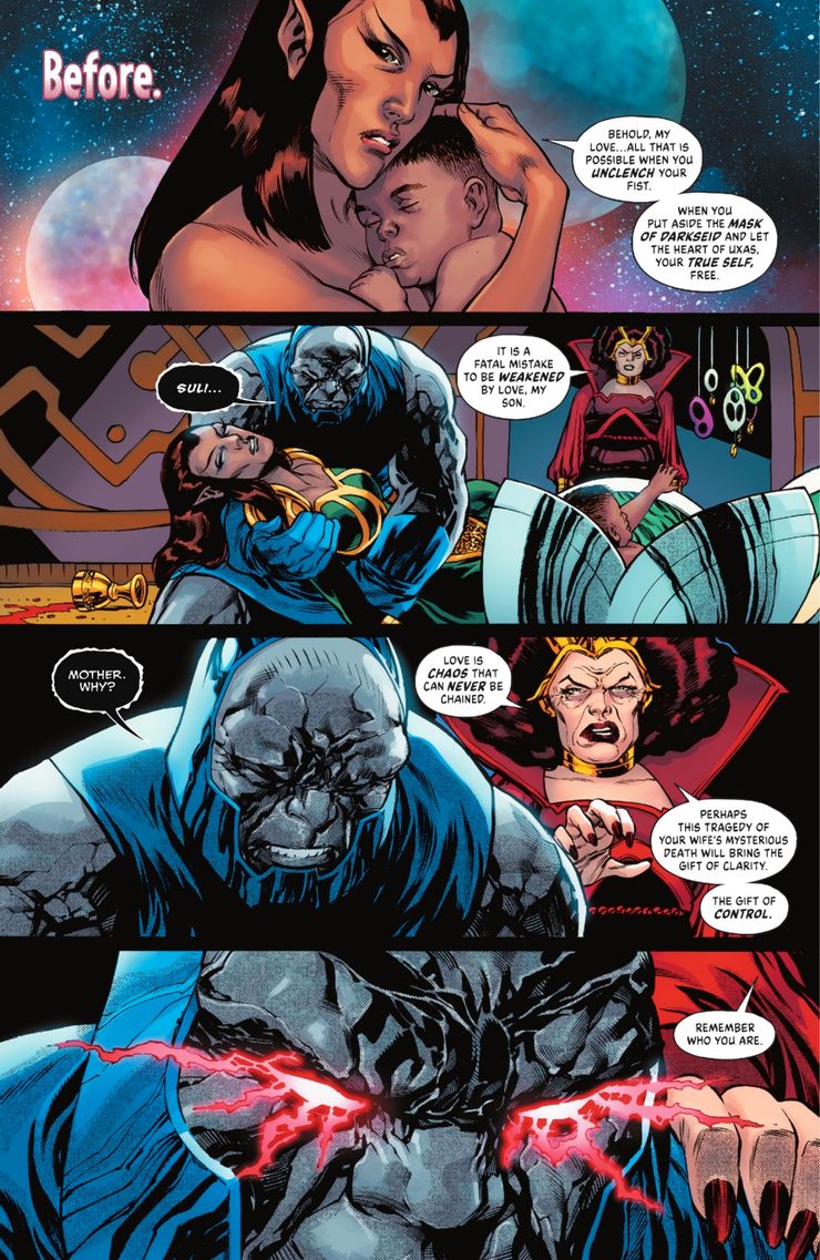 Introducido por primera vez en 1970 El amigo de Superman Jimmy Olsen #134 por Jack Kirby, Darkseid es el nombre elegido por el Príncipe Uxas, segundo en la línea de sucesión al trono de Apokolips y uno de los Nuevos Dioses. Desde la infancia, Darkseid tuvo ambiciones oscuras y poco confiables, asesinando a su hermano mayor Drax para reclamar la legendaria Fuerza Omega y empujándose al frente de la fila para el trono. Finalmente, Darkseid conoció y se enamoró de la hechicera y científica apokoliptana Suli, quien se convirtió en su esposa y madre de su hijo Kalibak, antes de que su madre, Heggra, ordenara a Desaad que envenenara a Suli hasta la muerte, porque pensó que Suli estaba debilitando a Darkseid. Discutir este origen sexista no es tratar de perdonar a Heggra por lo que hizo, sino preguntar: “¿Por qué DC necesitaba mantener este origen?“