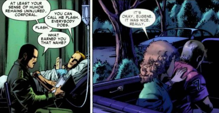 En El asombroso Hombre Araña #574 por Marc Guggenheim, Barry Kitson, Mark Farmer y Antonio Fabela de Studio F, se cuenta la historia de Flash Thompson que regresa al servicio militar activo. El cómic cuenta la desgarradora historia de Flash que se reincorpora al ejército y hace un sacrificio increíble para salvar a un compañero soldado, ya que perdió ambas piernas para salvarlo. Sin embargo, uno de los elementos más tontos de la historia es cuando un general pide hablar con él, donde le pregunta a Thompson cómo se ganó el apodo de “Flash”. El cómic muestra a Thompson en un automóvil con una mujer, quien le dice: “Está bien, Eugene. Fue agradable. De verdad”, explicando que su encuentro romántico terminó en un instante.